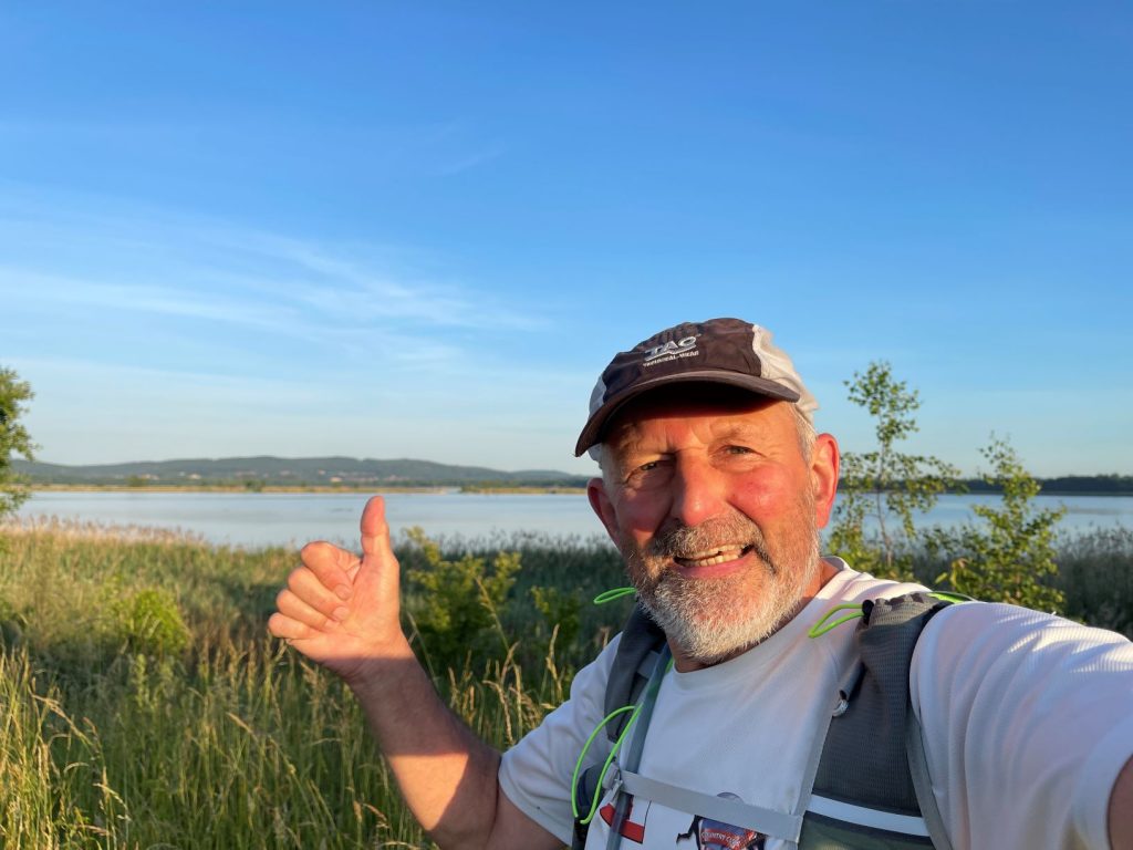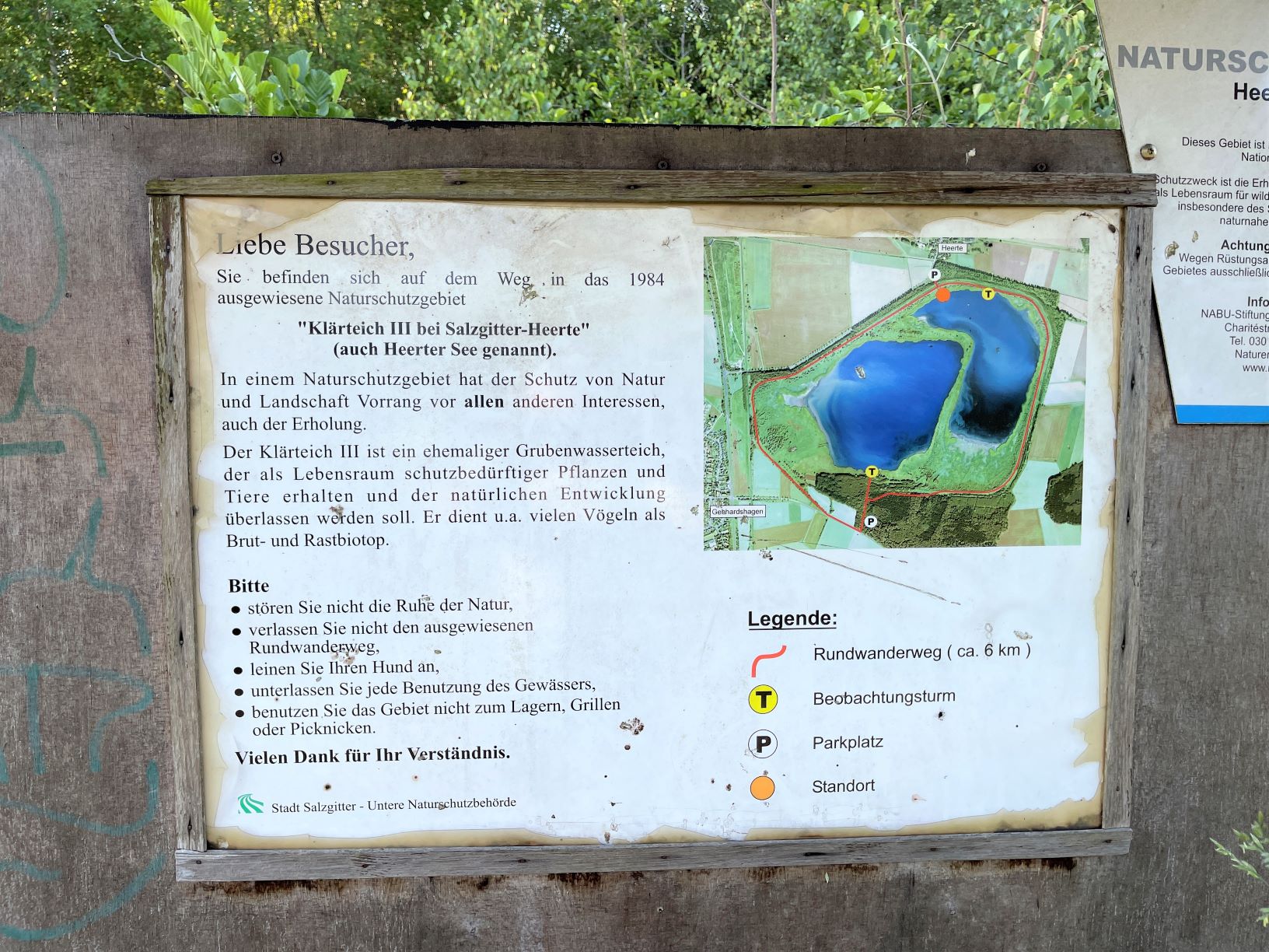 Das ist die Runde!Ich starte schon gegen 5:30 Uhr, die Sonne ist schon aufgegangen, wir haben ja schließlich den 16. Juni, bald ist Mittsommer!Um diese Uhrzeit ist es noch …… relativ erträglich, aber schon fast 20°!Die Natur hat hier absoluten Vorrang …… und die zu bewältigende Strecke ist die einzige Möglichkeit, den See zu umrunden!Nur an wenigen Stellen gibt die üppige Vegetation …… den Blick auf den Heerter See freiDie Natur ist auf eindrucksvolle Weise dabei, … … sich die Wege zurückzuerobern!Am Beobachtungsturm gegenüber von Start und Ziel kann ich den See direkt vom Ufer überblicken Inzwischen bin ich auf der 2. Runde …… und nutze die wunderbare Aussicht zu einem PanoramafotoDer Weg verläuft auf einem aufgeschütteten Damm zwischen See und übriger Landschaft, der Heerter See wurde also offensichtlich künstlich angelegtKurz nach 10 Uhr taucht auch das gesamte übrige Teilnehmerfeld auf, Marc, der diesen schönen Naturlauf möglich gemacht hat, …… und Ingo, er war am Vortag schon mit Olaf und Ulrich von Hahnenklee in einer großen Schleife nach Goslar und zurück gelaufen, Respekt!So, die beiden Schnellen machen sich wieder auf den Weg an die Spitze!Dieser Wiesenpfad sagt mir, daß ich meine 6. Runde begonnen habe, inzwischen ist die Temperatur auf ungefähr 30° geklettert !Hier kann sich jeder Naturfreund in Kurzform nochmal über dieses wunderbare Biotop informierenNoch einmal genieße ich die wenigen Schattenpassagen, und nach dem Zieleinlauf und einer Luxusdusche in meinem Wellneßbereich … … überredete mich Ingo, vom südlichen Beobachtungsturm den weiten Blick über das Naturschutzgebiet des Heerter Sees zu genießen!