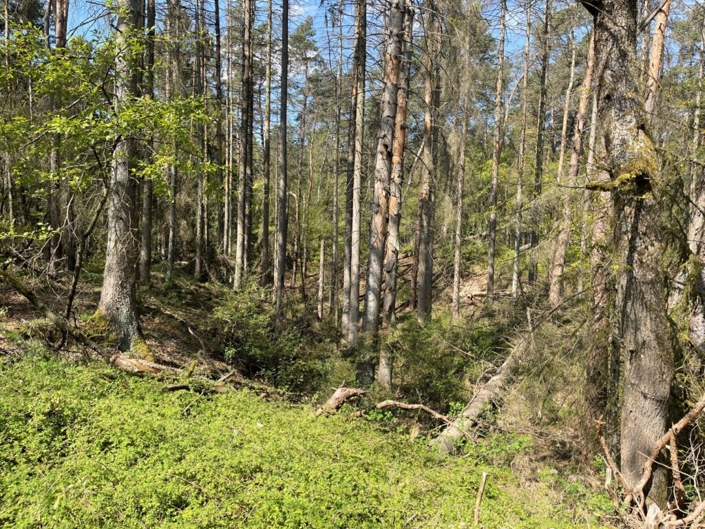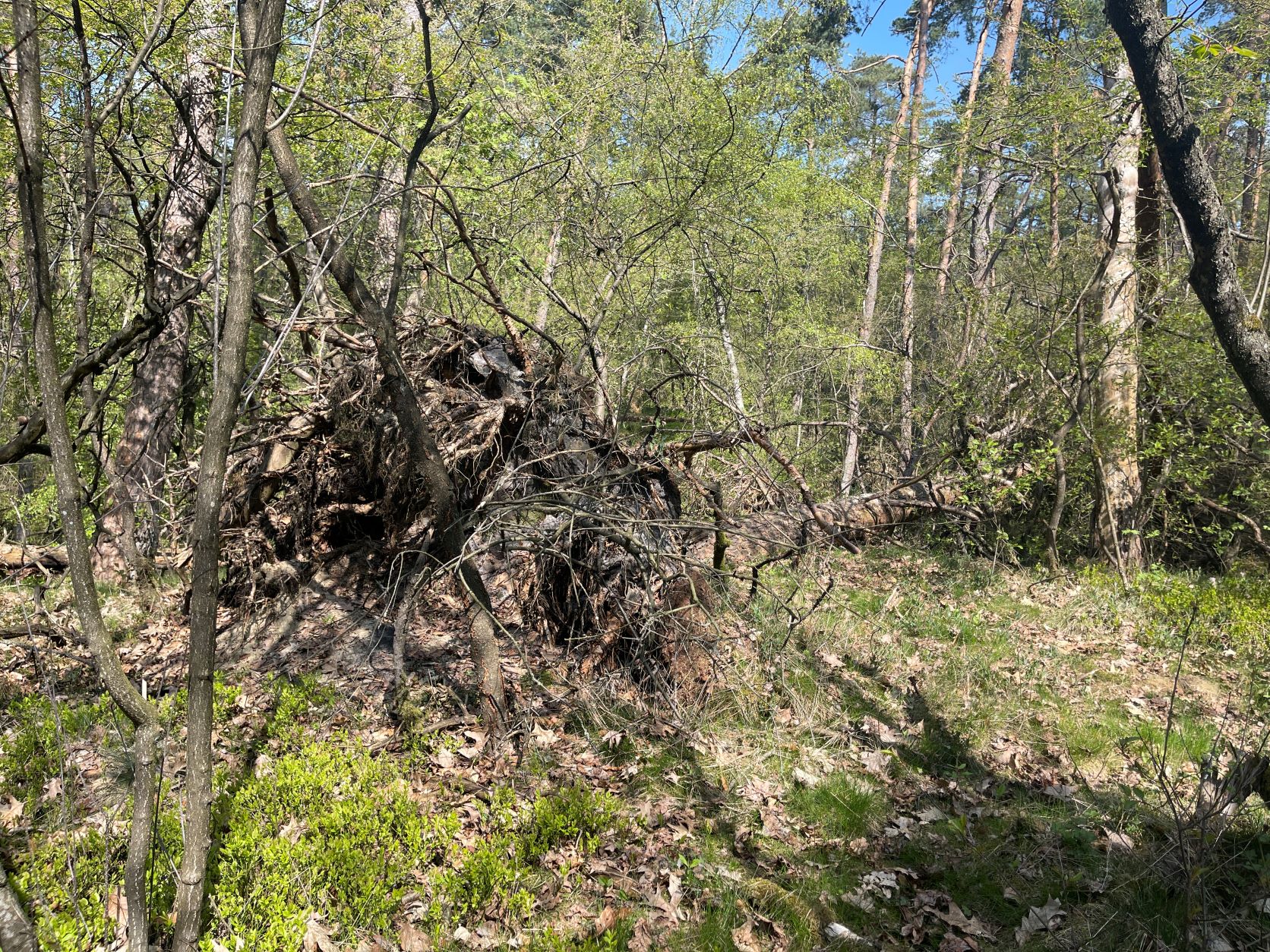 Ein Blick in die wild bewachsene Dünenlandschaft, umgestürzte Bäume bleiben liegen und so entsteht ein natürliches Biotop