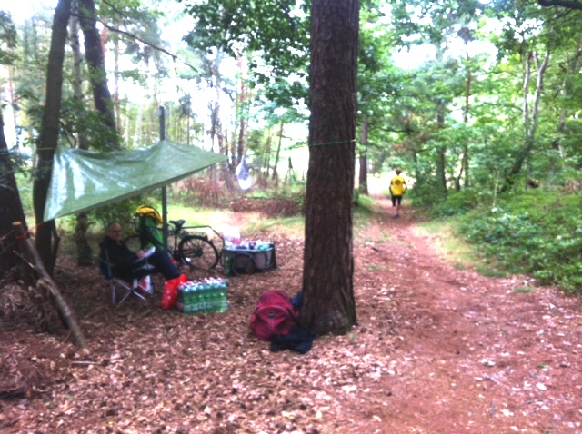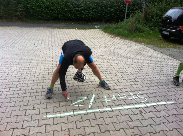 Auf dieser kurzen Runde trifft man sich öfter beim überholt werden oder an der Verpflegung, die Stimmung ist richtig gut. Auch ein paar staunende Spaziergänger sind unterwegs und fragen, was wir hier tun? „Ach, ein Marathon, wer organisiert das denn?“ „Der in dem grünen Trikot da hinten!“ Der Kurs war übersichtlich, aber in der ersten Runde habe ich erstmal den schmalen Pfad nach links unten verpaßt und 100 m verloren, aber ich war nicht der einzige, der Altkanzler blieb mir auf den Fersen. Es lief / ging bei mir ganz gut, im letzten Drittel hatte ich eine kurze Schwächeperiode und kam kaum mehr die Berge hoch.