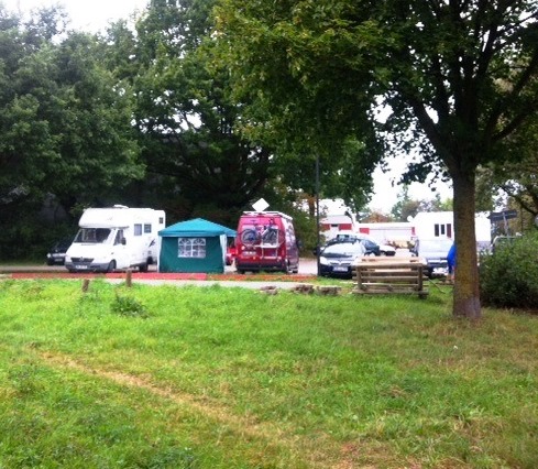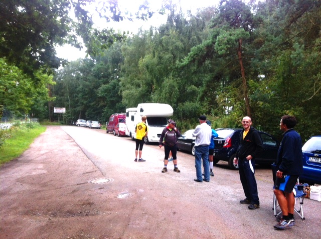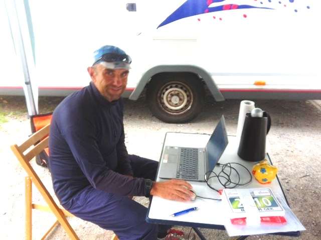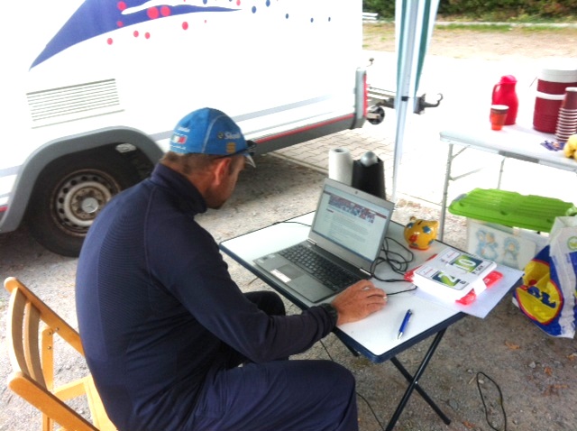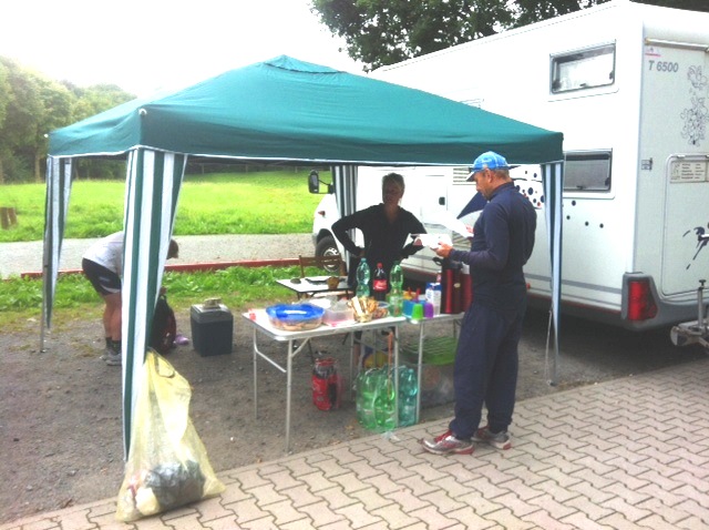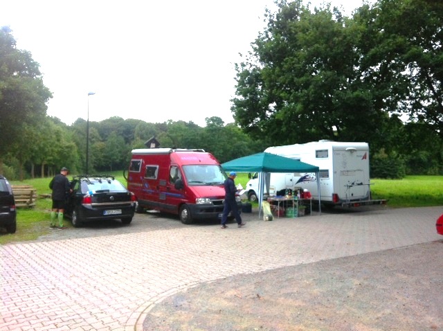 Am nächsten Morgen tut sich was auf dem Parkplatz, Chef Olaf mit seiner besseren Hälfte Wiebke und Bruder Uwe als Zeit-, Runden- und web-Organisator fangen sofort mit dem Aufbau von Start und Ziel an, Helmut stellt sein WoMo als Windschutz davor.