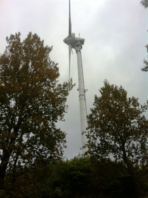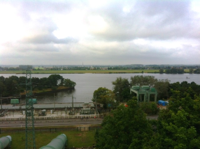 Von oben auf der Höhe des Windrades hat man einen weiten Blick hinunter über die Elbe.