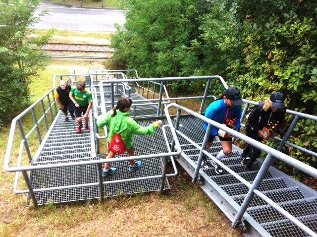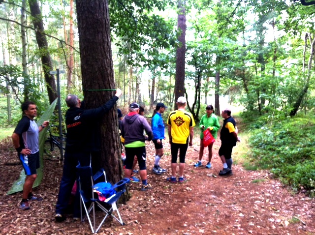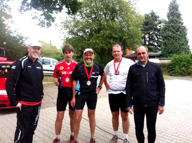Nun treffen die anderen Starter ein, Wolfgang, Rene´, Maria, Ute, Andres, Winfried und Jörg und nach dem Startsignal lernen wir auf einer kurzen Runde und 18 Turns über 2,3 km nordische Höhenmeter kennen, zum Teil ist das vielseitige Gelände crossartig. Olaf hat bei der Streckenauswahl keine mögliche Steigung ausgelassen!