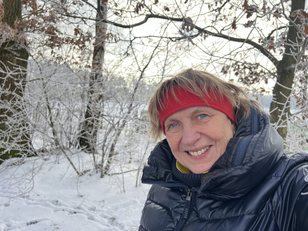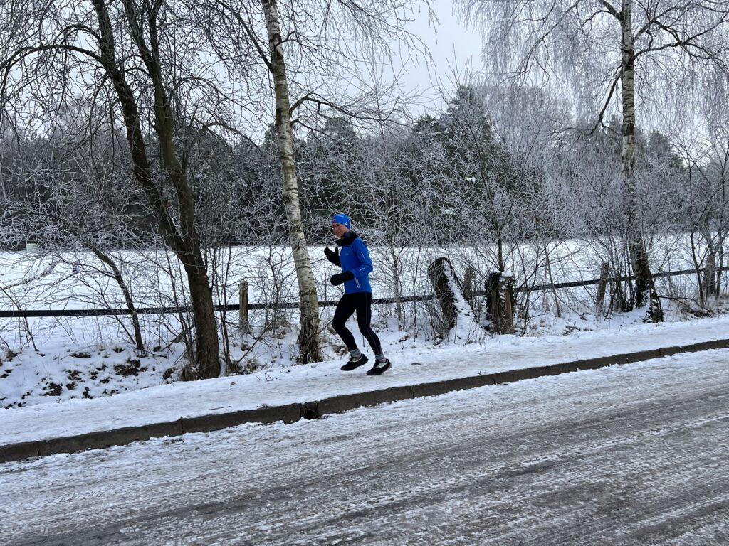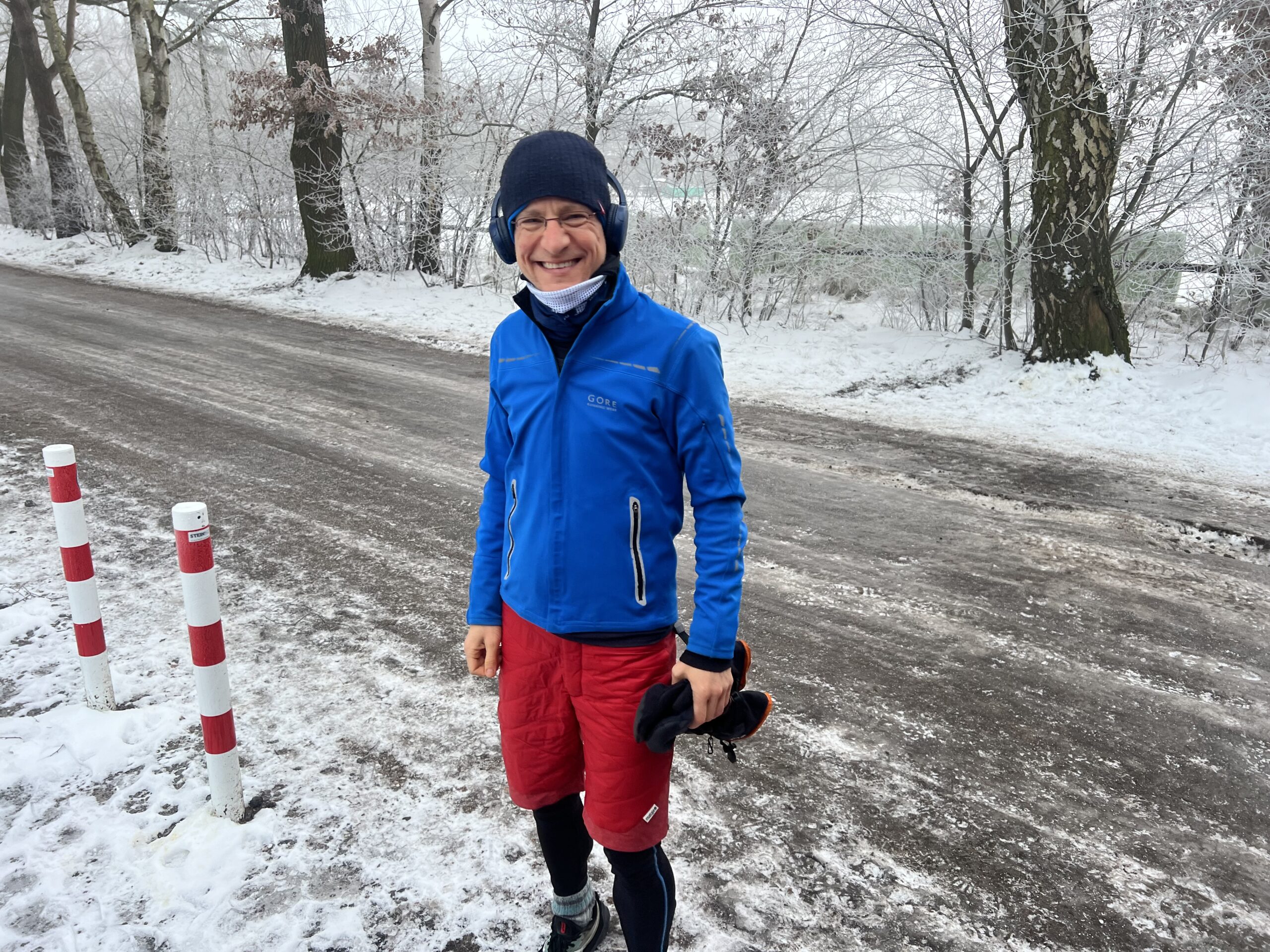 Jakob im Frost- und Glätteoutfit, er hatte gegen die Glätte Socken über die Laufschuhe gezogen
