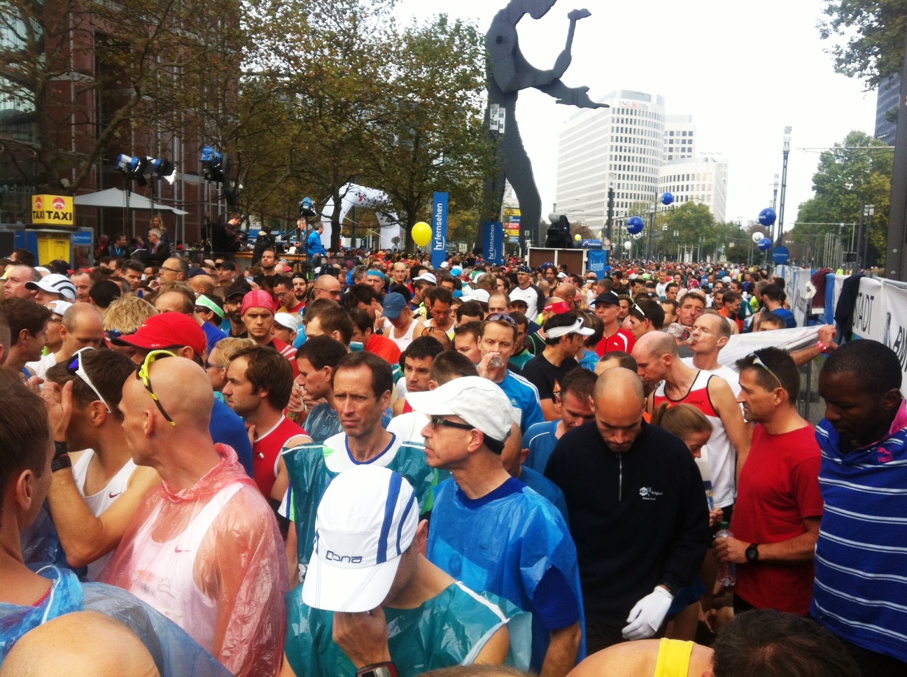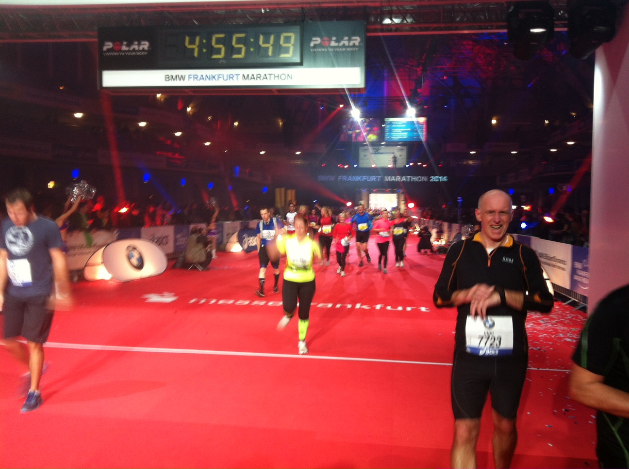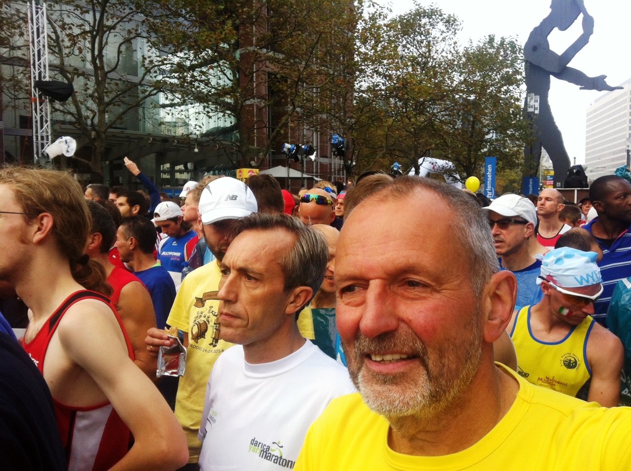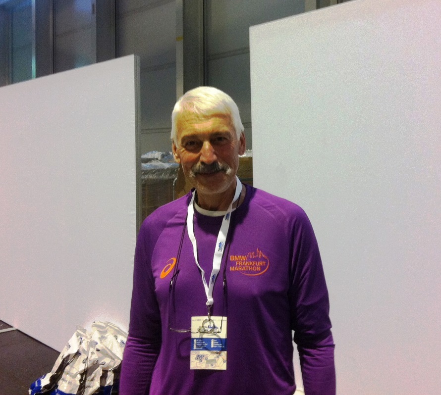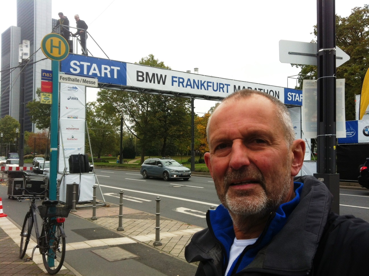 In der Festhalle war schon die Nudelparty in vollem Gange. Am späten Nachmittag hatte ich noch Zeit, das Äppelwoiviertel Sachsenhausen zu besuchen, hier war ich damals 1974 vorwiegend nach Feierabend tätig, um die Sitten und Gebräuche der Hessen und vorwiegend der Frankfurter zu studieren, im Klartext: Äppelwoi (Vergorenen Apfelmost) zu trinken, zum Beispiel in der Traditionswirtschaft Dauth Schneider. Hier bestellte ich mir gegrilltes Rippchen mit Sauerkraut und natürlich Apfelwein. Das war die ideale Vorbereitung auf den Marathon am Sonntag. Trotzdem ging ich früh schlafen, plus einer geschenkten Stunde Zeitumstellung. Am nächsten Morgen war ich nach 10 Minuten Fußweg in Halle 1 und konnte nach der Gepäckabgabe noch in Ruhe einen Capuccino trinken + ein Stück Apfeltorte.