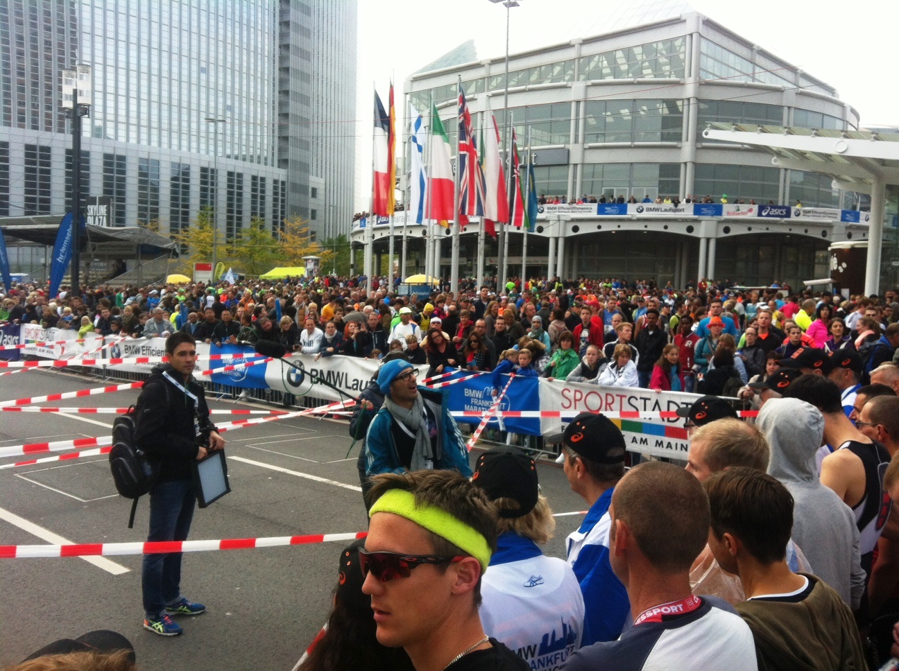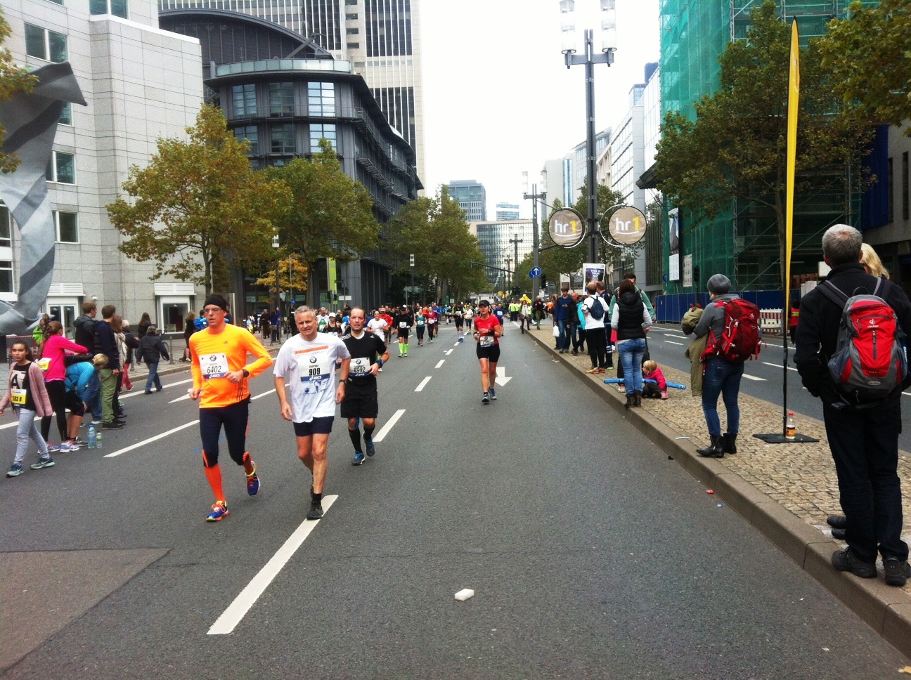 Der Start vor der Messe ging reibungslos, nachdem der Spaß-Sprecher die üblichen Sprüche losgelassen hatte (zeigt daß ihr alle da seid!, ich will alle eure Hände oben sehen, das ist euer Lauf……, bla… bla…. bla…..) Es ging jetzt in einigen Schleifen durch die Stadt, auch über den Main und später durch Außenbezirke,