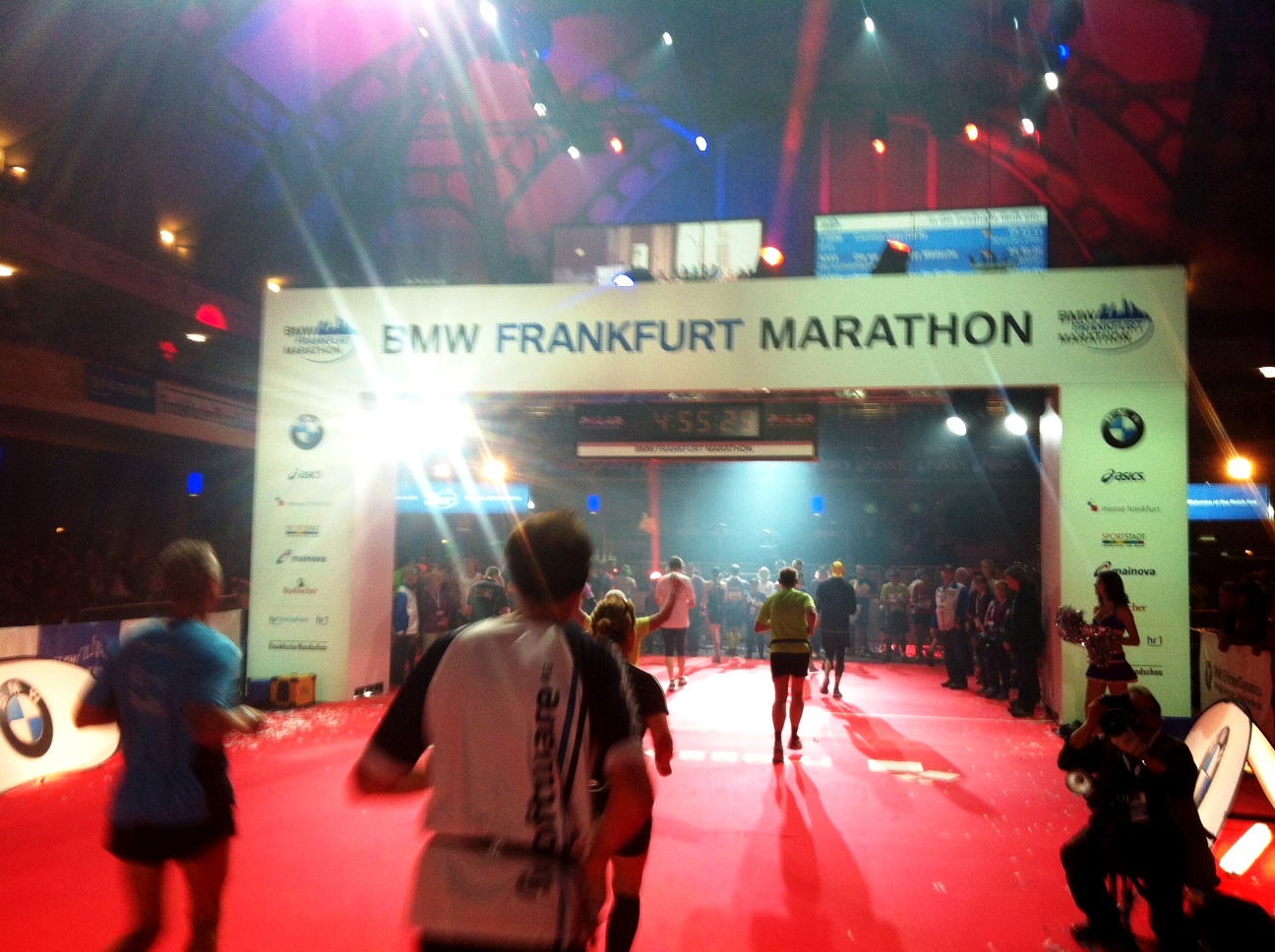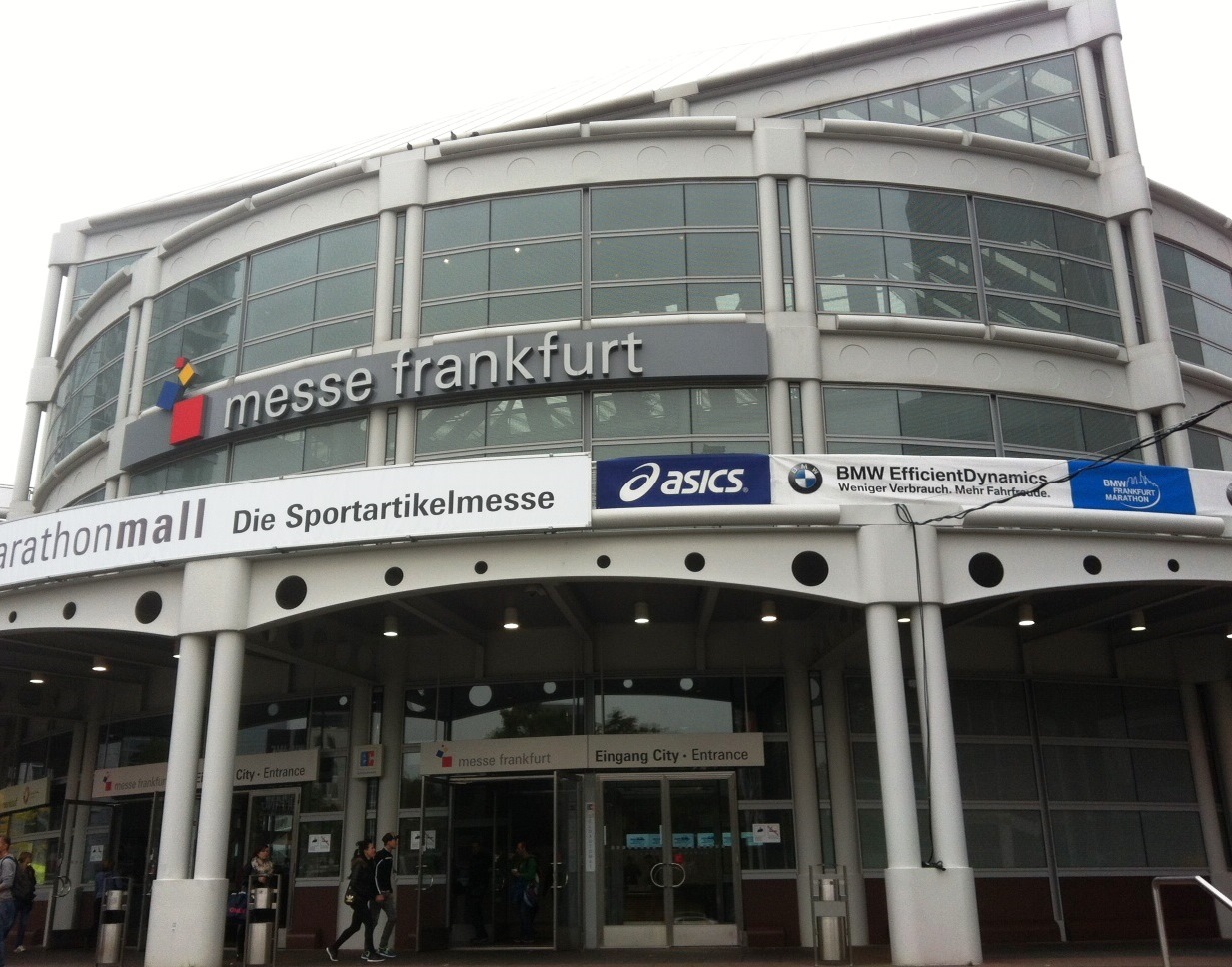 Gunla hatte mir ihren Frankfurt-Startplatz überlassen, da konnte ich ja nicht nein sagen! Vorgesehen war eine Fahrt mit dem Wohnmobil in die Mainmetropole, aber meine Firma machte mir mit einer plötzlichen Dienstreise einen Strich durch die Rechnung. So entschloß ich mich, nach der Schongau-Dienstreise am Freitag von München nach Frankfurt zu fliegen und einen zusätzlichen Tag in Mainhattan zu verbringen. Die Startunterlagen habe ich mir sofort nach meiner Ankunft im Hotel nahe der Messe abgeholt, Halle 1, Ebene 2. Ruth Jägers Ehemann und Betreuer Adam war hier für den Frankfurt Marathon engagiert und übergab mir persönlich den Starterbeutel.