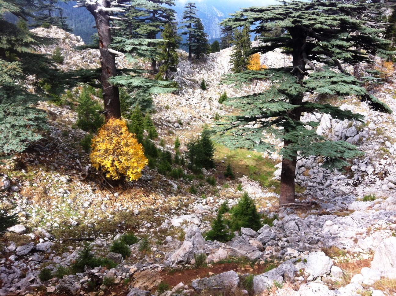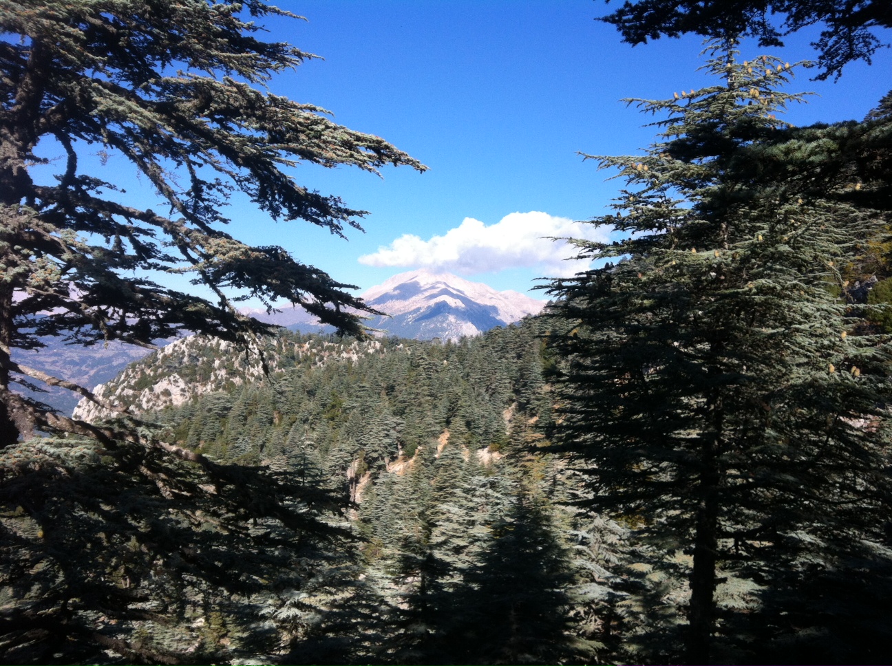 Mit schönem Blick über die Hochebene auf die Gipfel geht es in das Zedernschutzgebiet, einer dieser Bäume hat einen Durchmesser von 2,5 m und soll 745 Jahre alt sein. Der Bus bringt uns Richtung Mittelmeer, zwischendurch Mittagspause in einem urigen kleinen Restaurant mit Wildgarten.