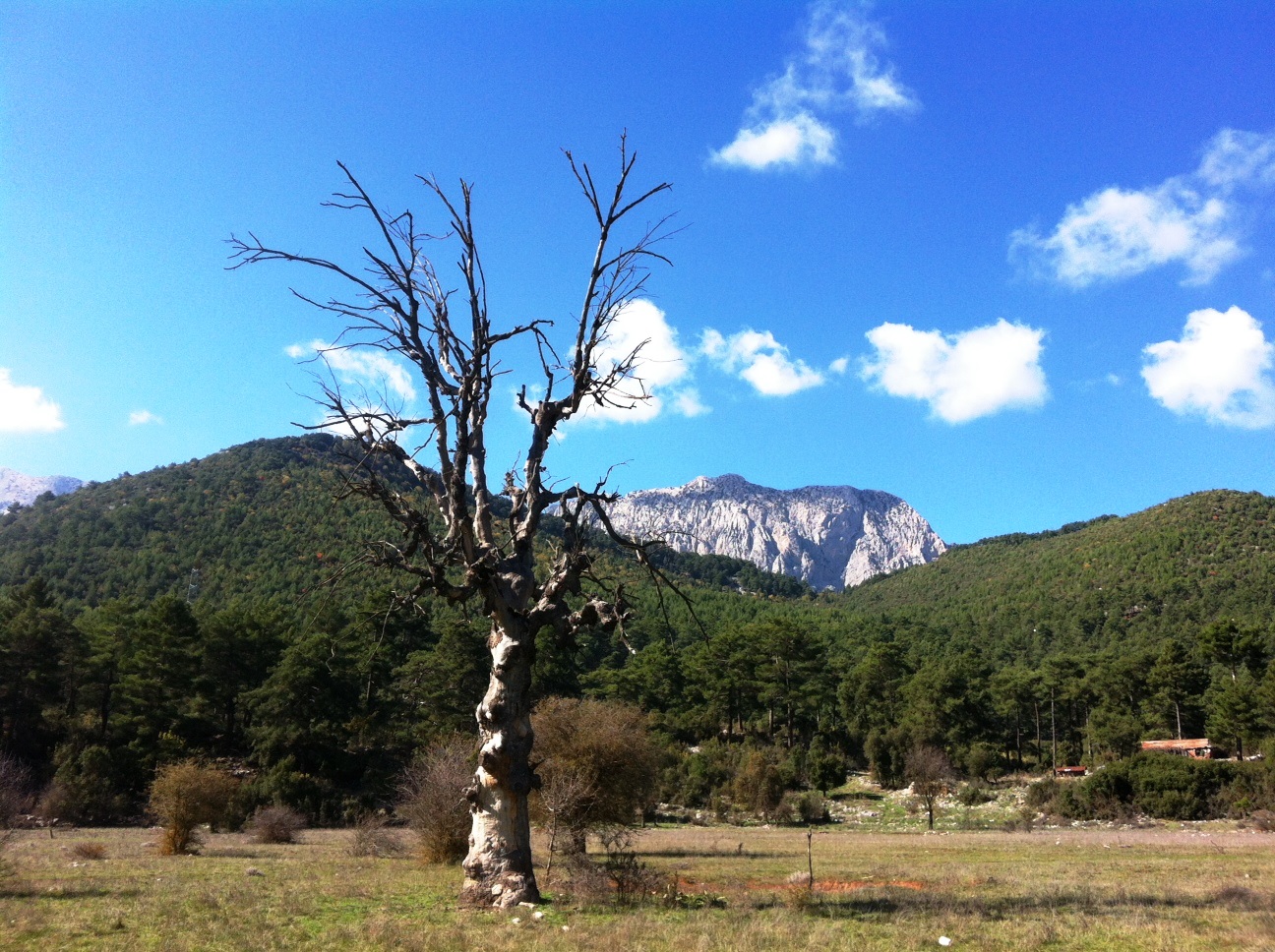 Über eine Scharte gelangen wir in ein kleines geschütztes Hochtal mit wenigen Bäumen, dann wunderbare Blicke über das Tal von Elmali und auf die gegenüberliegende Bergkette.