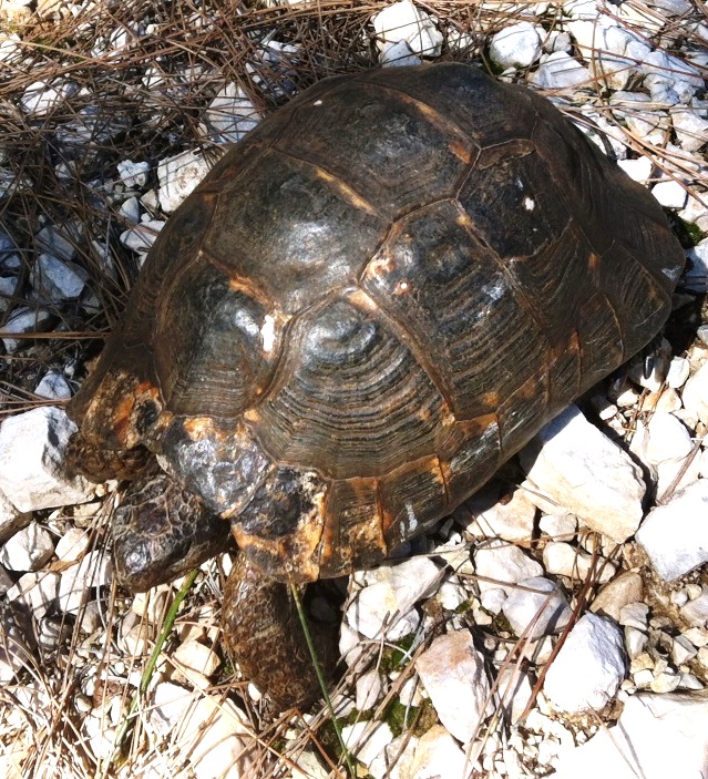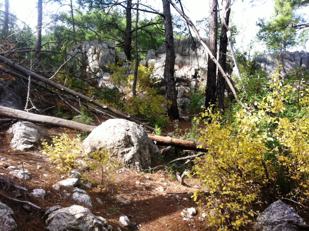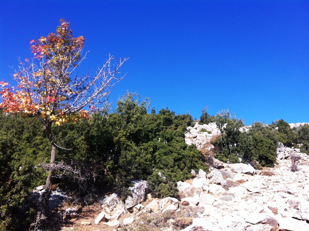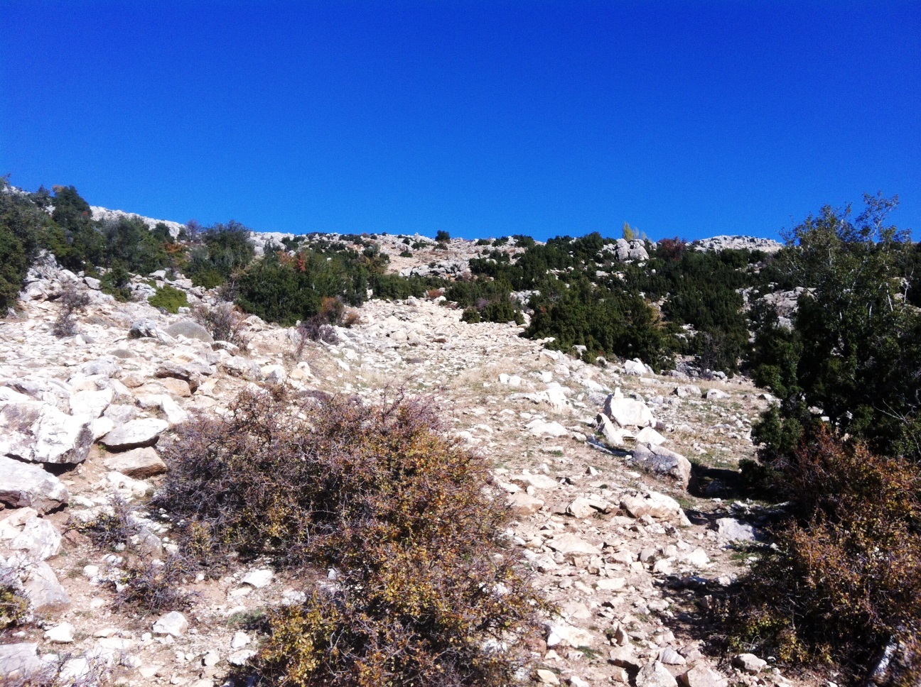 Dann geht es weiter mit dem Bus zum Hotel bei Ovacik, einsam gelegen auf 1250 m. Hier hat man eine wunderbare Aussicht auf die Berge und bis zum Meer hinunter, eine authentische Küche mit frischem Fladenbrot aus dem Holzofen, es ist eine perfekte Ausgangsbasis für die Wanderungen der kommenden Tage. Die Tour zum Eingewöhnen hat keine großen Höhenunterschiede. Man kann im Taurusgebirge keine deutlichen und markierten Wanderpfade wie in den deutschen Mittelgebirgen oder den Alpen erwarten. Eine Ausnahme zumindest bildet der ca. 500 km lange Lykische Weg, der dem Südrand des Gebirges folgt, bekanntgemacht und markiert von einer Engländerin. So geht es aber fast weglos durchs Gelände, es sind die Pfade der Hirten und der Nomaden. Heute ist auch eine längere Passage über Blockgestein zu bewältigen, dann wieder durch Macchia hinauf, durch niederen Wald und über Grashänge. Hm ↑300 ↓324 7,9 km