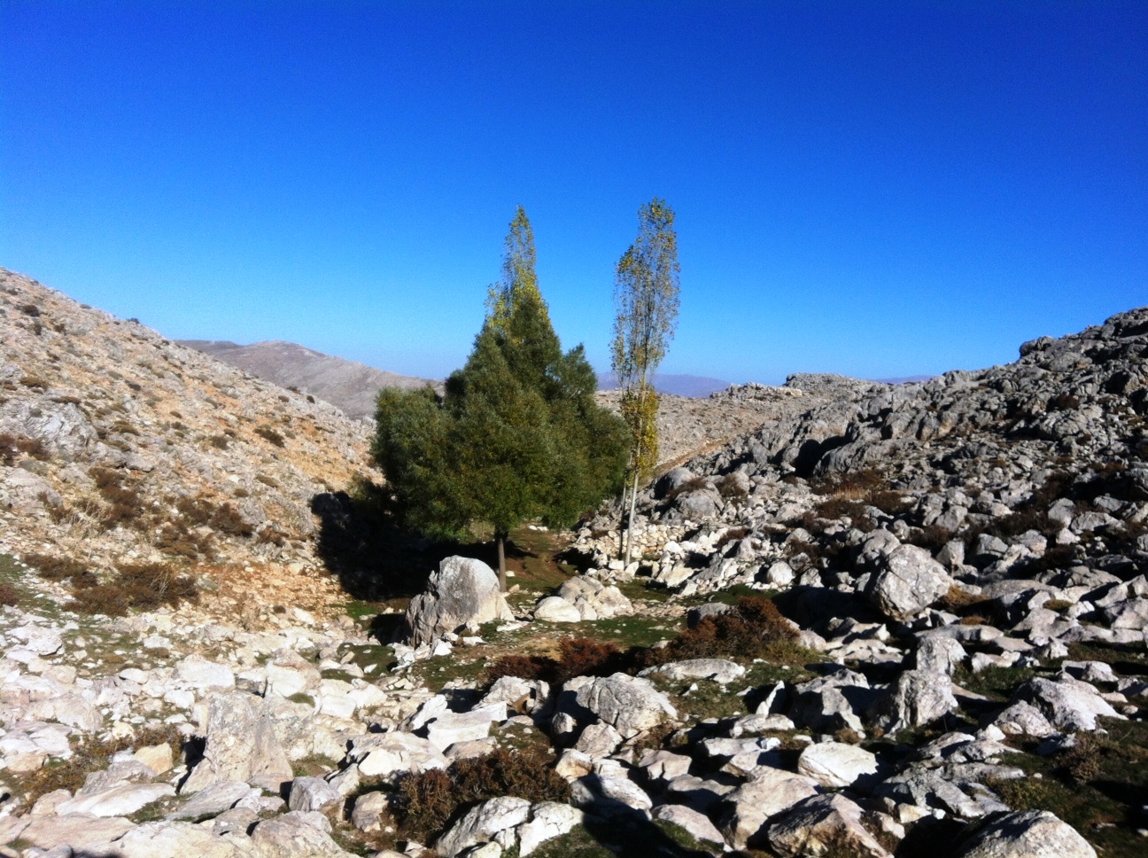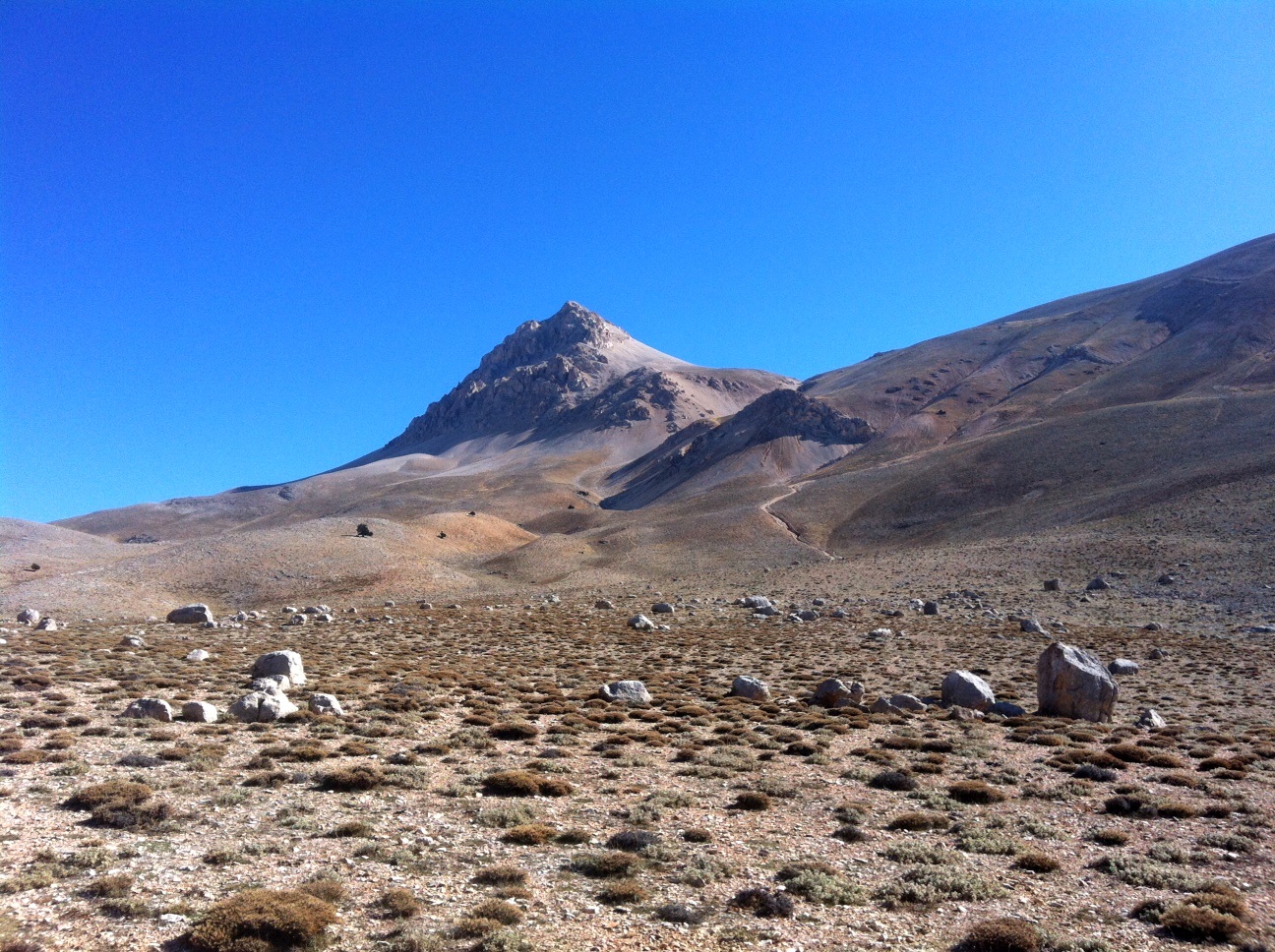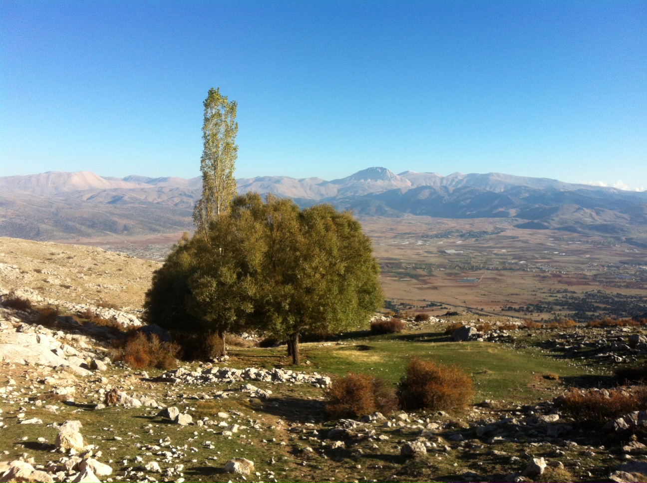 nur von Dornengestrüpp und niederen Gräsern und Flechten bewachsen, weiter unten gab es noch Wildbirnen- und Feigenbäume. Unser türkischer Führer erzählt von den Nomaden, die hier oben mit den Weidetieren, Schafen und Ziegen, ihr Sommerlager haben und jetzt schon wieder unten im Tal sind.