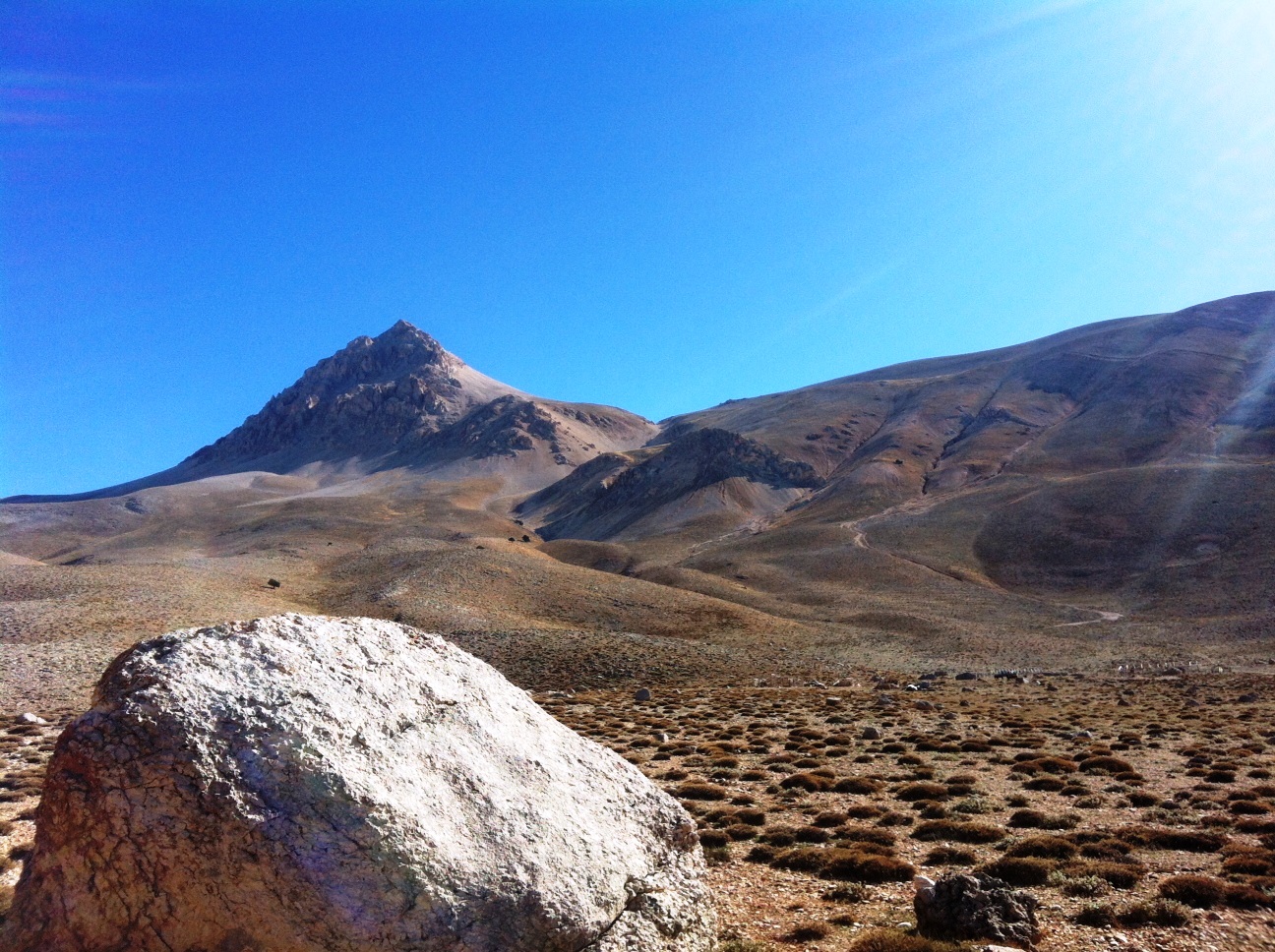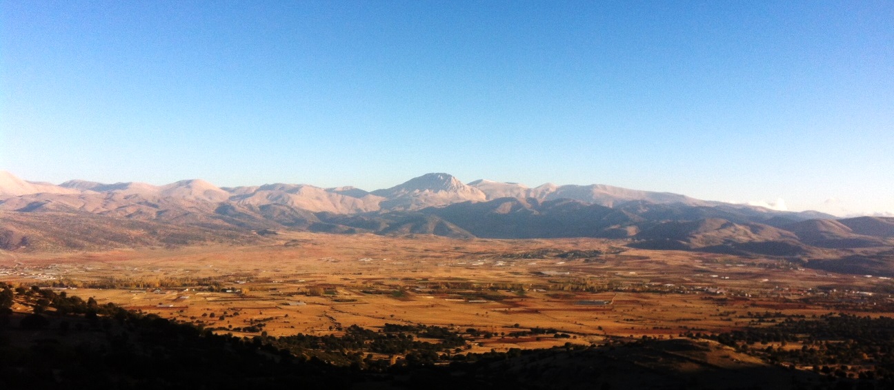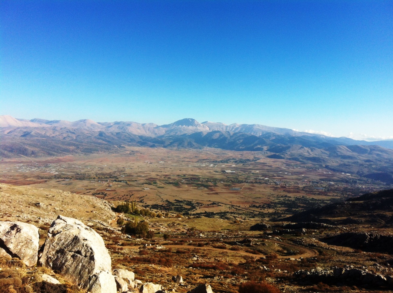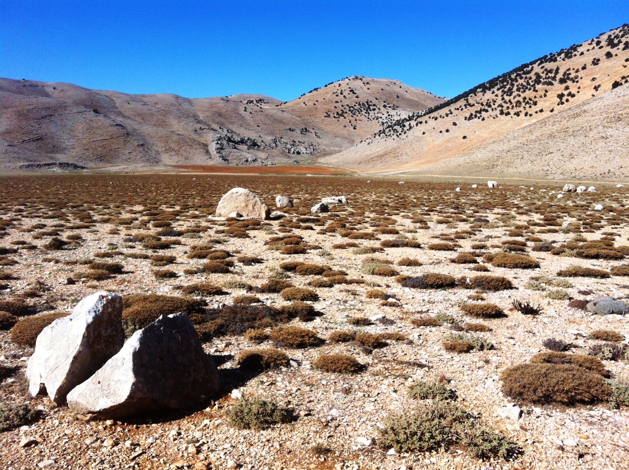 nur von Dornengestrüpp und niederen Gräsern und Flechten bewachsen, weiter unten gab es noch Wildbirnen- und Feigenbäume. Unser türkischer Führer erzählt von den Nomaden, die hier oben mit den Weidetieren, Schafen und Ziegen, ihr Sommerlager haben und jetzt schon wieder unten im Tal sind.