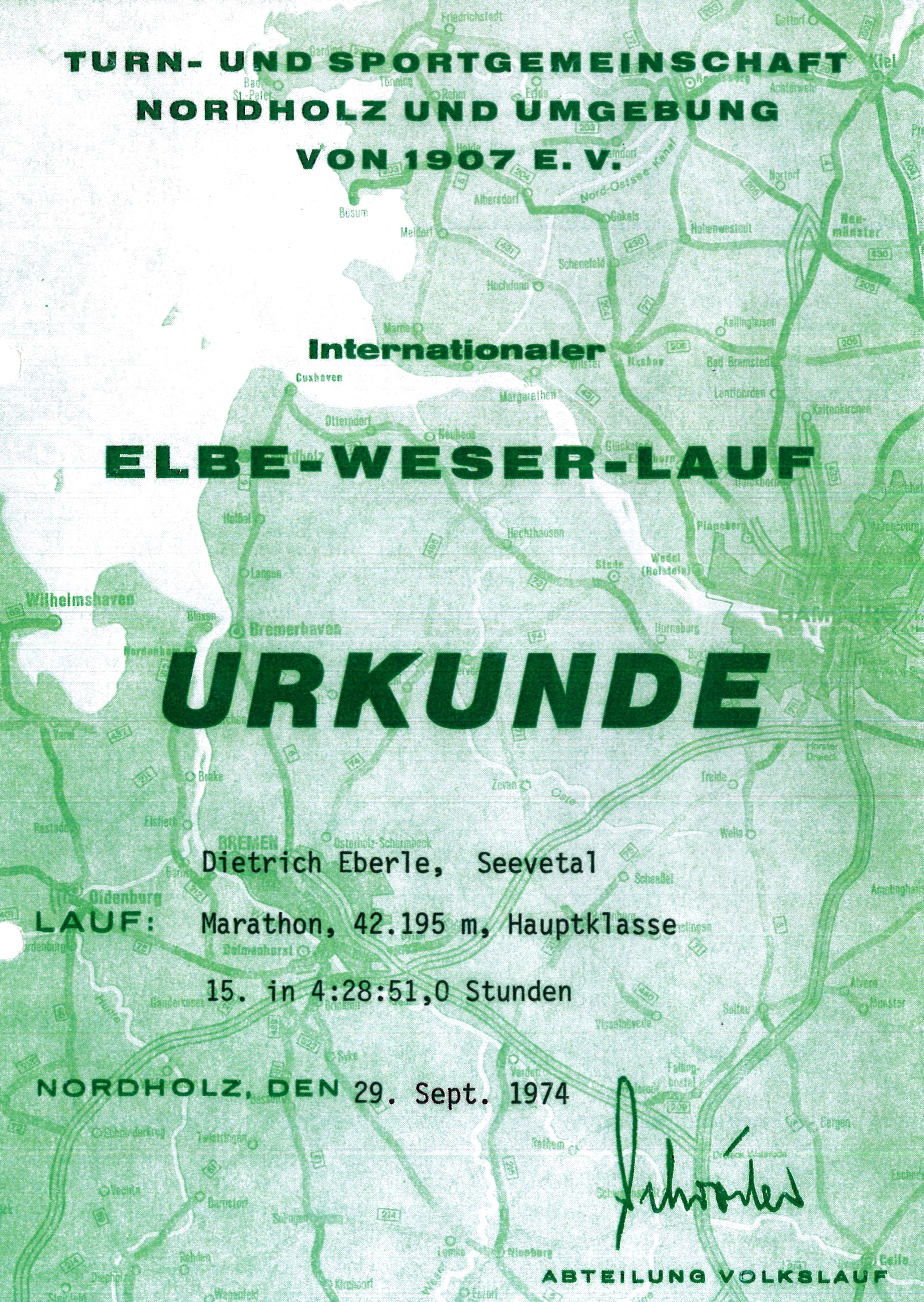 Es fing ganz harmlos an. Im Alter von 12 Jahren habe ich mit Freunden gestoppte Rundenläufe um das große Mehrfamilienhaus, in dem wir wohnten, veranstaltet, wer ist 10mal rum am schnellsten? Um 1966 herum begann ich, teilweise mit Freunden oder alleine, im Wald ein paar km für die Fitness zu laufen, zuerst nur am Wochenende, dann auch öfter. Irgendwann erzählte mir meine Mutter, daß mein Cousin „da immer solche Volksläufe macht“. Ich erfuhr, daß diese Läufe, von Sportvereinen organisiert, bundesweit stattfinden und es sogar einen „Volkslaufkalender“ gibt. Also machte ich mich 1967 an einem Sonntagmorgen per Bus und Bahn auf den Weg von Hittfeld nach Wedel bei Hamburg, um die 3000 m für die „Männliche Jugend A“ zu laufen. Den Startschuß gab der Sensationsdarsteller und Stuntman Arnim Dahl, er war viel kleiner als ich dachte, hatte aber die Ausstrahlung einer gespannten Stahlfeder. Berühmt war er durch Drahtseilakte, Abseilen vom Hubschrauber auf einen fahrenden Zug, Sprünge durch Glastüren usw….. Soviel konnten wir jugendlichen Läufer nicht bieten, zumal wir falsch geleitet wurden und schon nach 1 km wieder im Ziel ankamen, also eigentlich ein frustrierender Auftakt für mich! Aber, wie sage ich immer, „niemals aufgeben!“ Am 03.04.1972 dann mein erster Volkslauf über 10 km um den Ratzeburger Küchensee, hier trainierte auch der Deutschlandachter, „Ratzeburger Ruder-Recken“ genannt. Ich lief etwa 50 min. Bald hatte ich feste Trainingsstrecken im Wald, stoppte und dokumentierte die Zeiten. Ich nahm an Volksläufen in der Umgebung teil, z.B. in Klein Meckelsen, Travemünde, Cuxhaven, Hemslingen, Uelzen, Lüneburg, Poppenbüttel, auch in Westerland/Sylt ….. und mein erster langer VL in Karlshöfen ging über knapp 19 km. Inzwischen hatte ich meinen alten Schulfreund Wolfgang Kahlert getroffen, der jetzt wieder in der Gegend wohnte, und in der Folge fuhren wir gemeinsam, manchmal mit meinem Bruder und anderen Freunden zusammen, zu vielen 10- und 20 km -Läufen im weiteren Umkreis um meinen Heimatort Hittfeld. Einen „Halbmarathon“ über 21,098 km gab es noch nicht, der wurde später aus Marketinggründen erfunden. Man läuft ja auch keinen „Halbspartathlon“ und unternimmt keine „Halbweltreise“, also: ganz oder gar nicht! Irgendwann 1974 kamen wir auf den glorreichen Gedanken, man könnte doch mal einen Marathon laufen, das wäre ja schließlich nur etwas mehr als das doppelte eines 20ers! Also, zweimal die Zeit für einen 20er gerechnet sind 2 x 1:30 h = 3:00 h + 15 min für die fehlenden 2,195 km + etwas Zugabe, weil man ja nachher etwas?? langsamer wird, ergab nach unserer Rechnung ungefähr 3:30 h als Endzeit. Es gab damals nicht so viele Marathons in Deutschland, u.a. Baldeney-See Essen, Schwarzwald Bräunlingen, Rund um Wellen, Husum, und …. den Marathon in Nordholz, an der Nordseeküste südwestlich von Cuxhaven gelegen, veranstaltet vom örtlichen Sportverein. Nach meiner Erinnerung war das Wetter an diesem 29. September 1974 recht warm, Wolfgang und ich liefen guten Mutes los auf dem ländlichen Kurs über kleine Nebenstraßen. Zuerst war alles ganz normal, aber zwischen 20 und 30 km hatten wir dann die „Unheimliche Begegnung der dritten Art“! Jeder weiß, was gemeint ist, Muskeln und Kreislauf waren in eine unbekannte Zone gekommen, und die Pausen an den Verpflegungsstellen wurden immer länger, unterwegs verabschiedeten wir uns von unserer angepeilten Zeit, kamen aber ohne größere Probleme stolz ins Ziel, meine Zeit war 4:28 h, und nach der kurzen „ich laufe nie wieder Marathon“- Phase beschlossen Wolfgang, mein Bruder Manfred und ich, 14 Tage später gemeinsam zum damals größten deutschen Marathon (fast 2000 Finisher) nach Bräunlingen im Schwarzwald zu fahren. Wir übernachteten in einer Privat-Pension. Wie damals üblich, schliefen die Kinder der Gastgeber-Familie auf dem Dachboden, damit die Zimmer für die Gäste frei wurden. Am Marathon-Vorabend war in der Stadthalle von Bräunlingen mächtig was los mit Musik und toller Stimmung! Am nächsten Morgen dann ein ganz anderes Bild, die aus meiner Sicht unzähligen Starter machten sich bereit für den 7. Internationalen Schwarzwaldmarathon, der auch der weltälteste Frauenmarathon ist. Die Läuferin Martha v. d. Berge war bereits 1968 erste offizielle Siegerin eines Marathons. Davor war es für Frauen offiziell verboten, die 42,195 km zu laufen, teils liefen sie als Männer verkleidet. Aber zurück in die Stadthalle! Es roch hier ziemlich streng nach allen möglichen Einreibemitteln, die auch wir benutzten und als Sammelbegriff „Pumasalbe“ nannten. Am Start waren über zweieinhalbtausend Teilnehmer und die große Runde durch den Hochschwarzwald führte ca. 12 km über Asphalt-Nebenstraßen, sonst nur Waldwege mit leichten Steigungen.