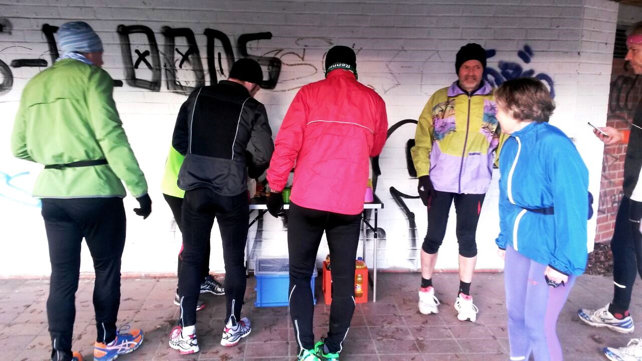 Es war um 0°, aber die Sonne ließ die Temperaturen dann bis auf ca. 8° ansteigen. Selber habe ich keine Fotos geschossen, diese Bilder verwende ich mit Marcs freundlicher Genehmigung. Die Verpflegung ist witterungsgeschützt am Ziel aufgebaut.