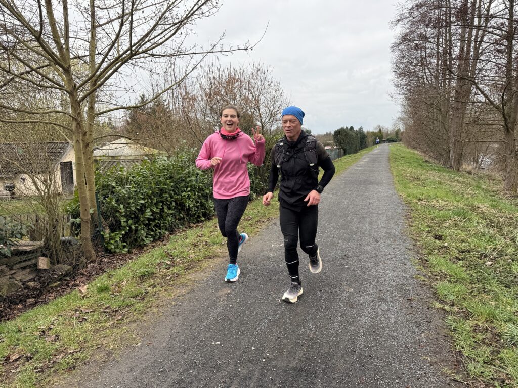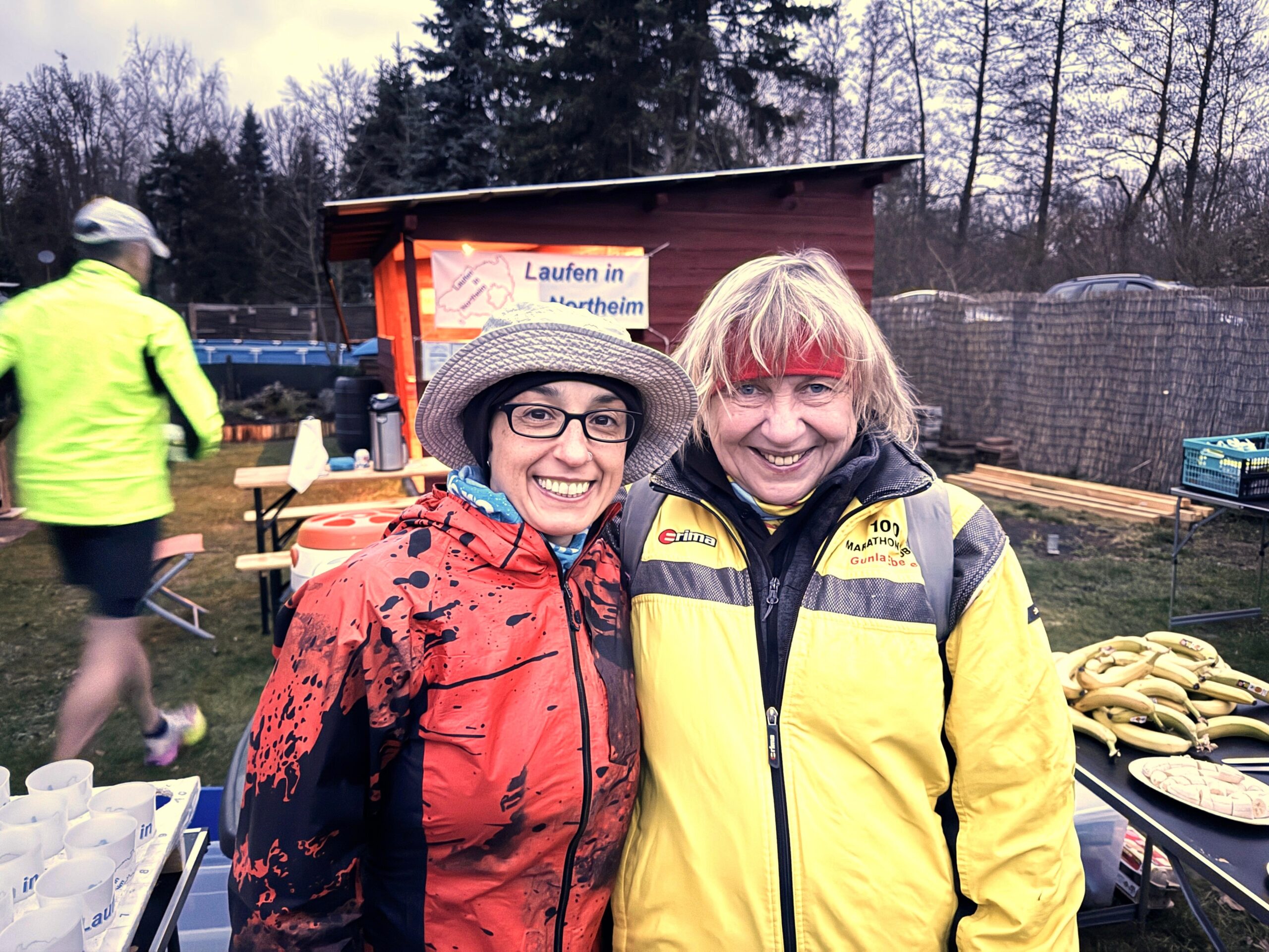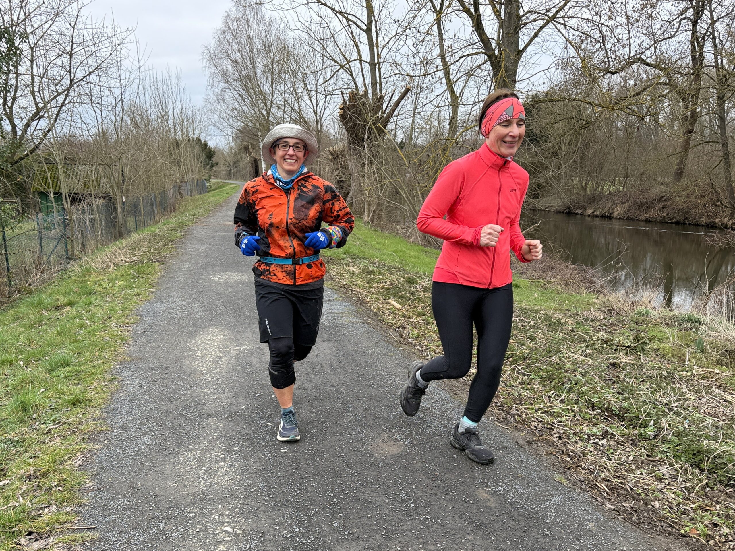 … munter weiter, Sara und ich auf dem Rhumedeich, Sara ist die Rekordteilnehmerin hier beim Tageslichtultra, sie hat an allen 13 Läufen teilgenommen 😮 Glückwunsch!