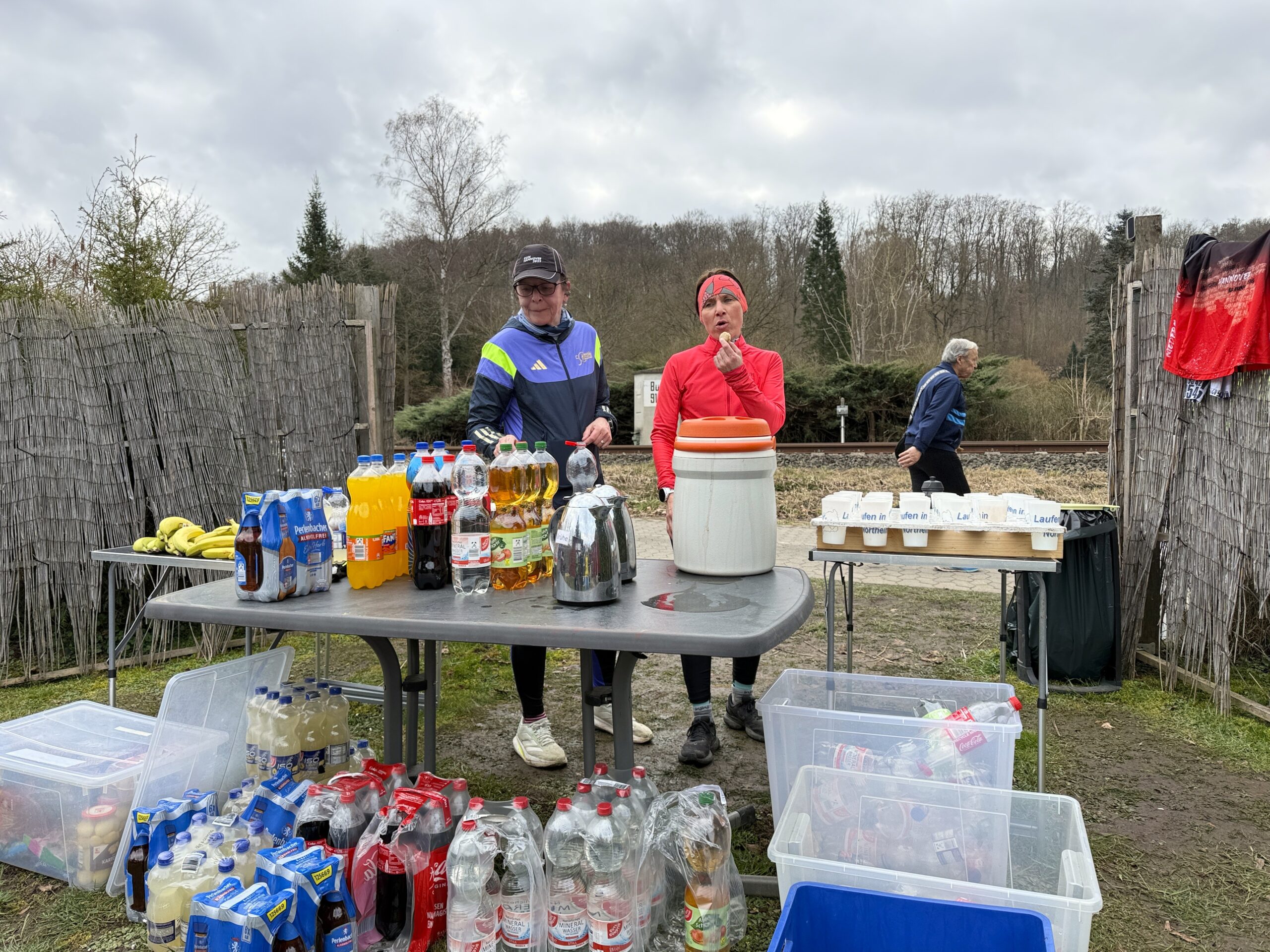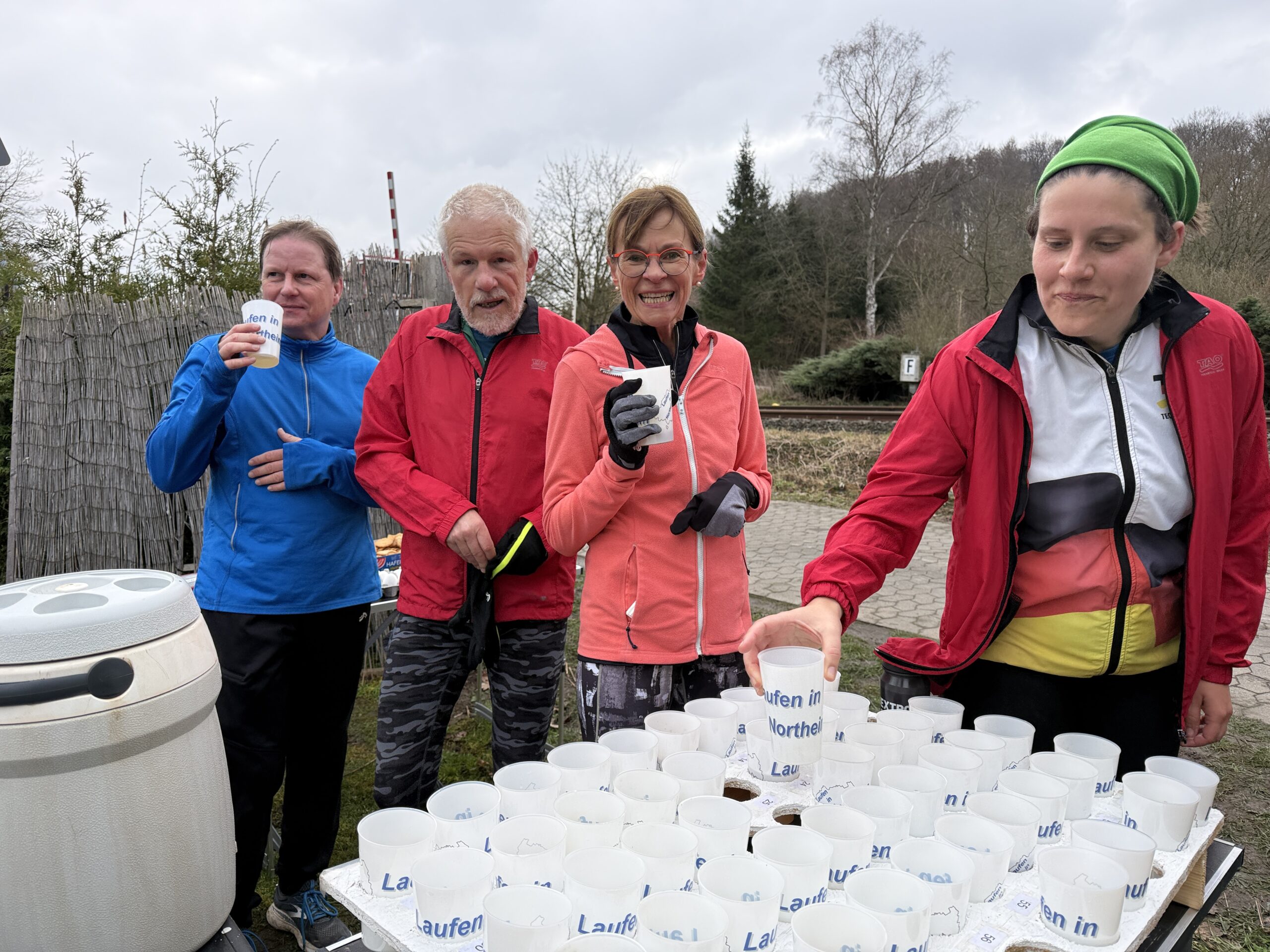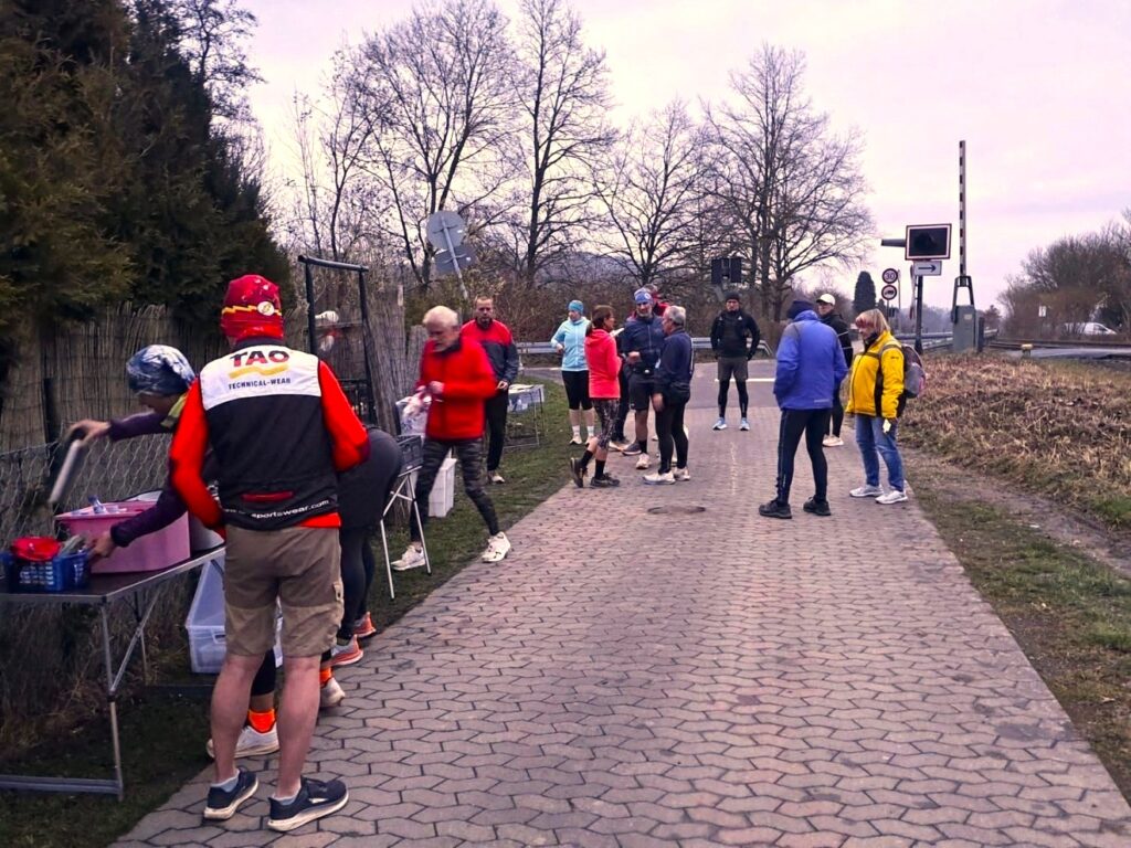 An der Verpflegung laben sich Thorsten G., Joachim, Gisela und Sara an Michaels Getränkeauswahl, es gibt heiße Brühe, Früchtetee, Wasser, Cola, Fruchtsäfte und vieles anderes! 🙂 Danke an Paparazzi Gunla für die Fotos, die ich hier im Bericht verwenden darf! Sie geht jetzt entgegen der Laufrichtung auf die Strecke …