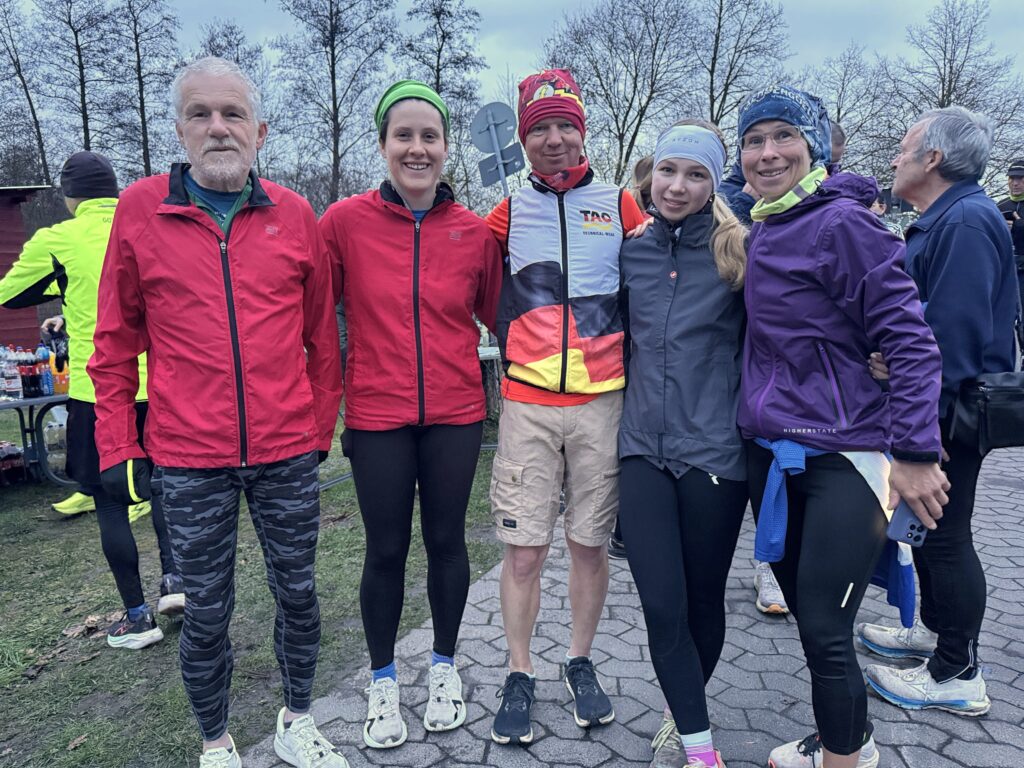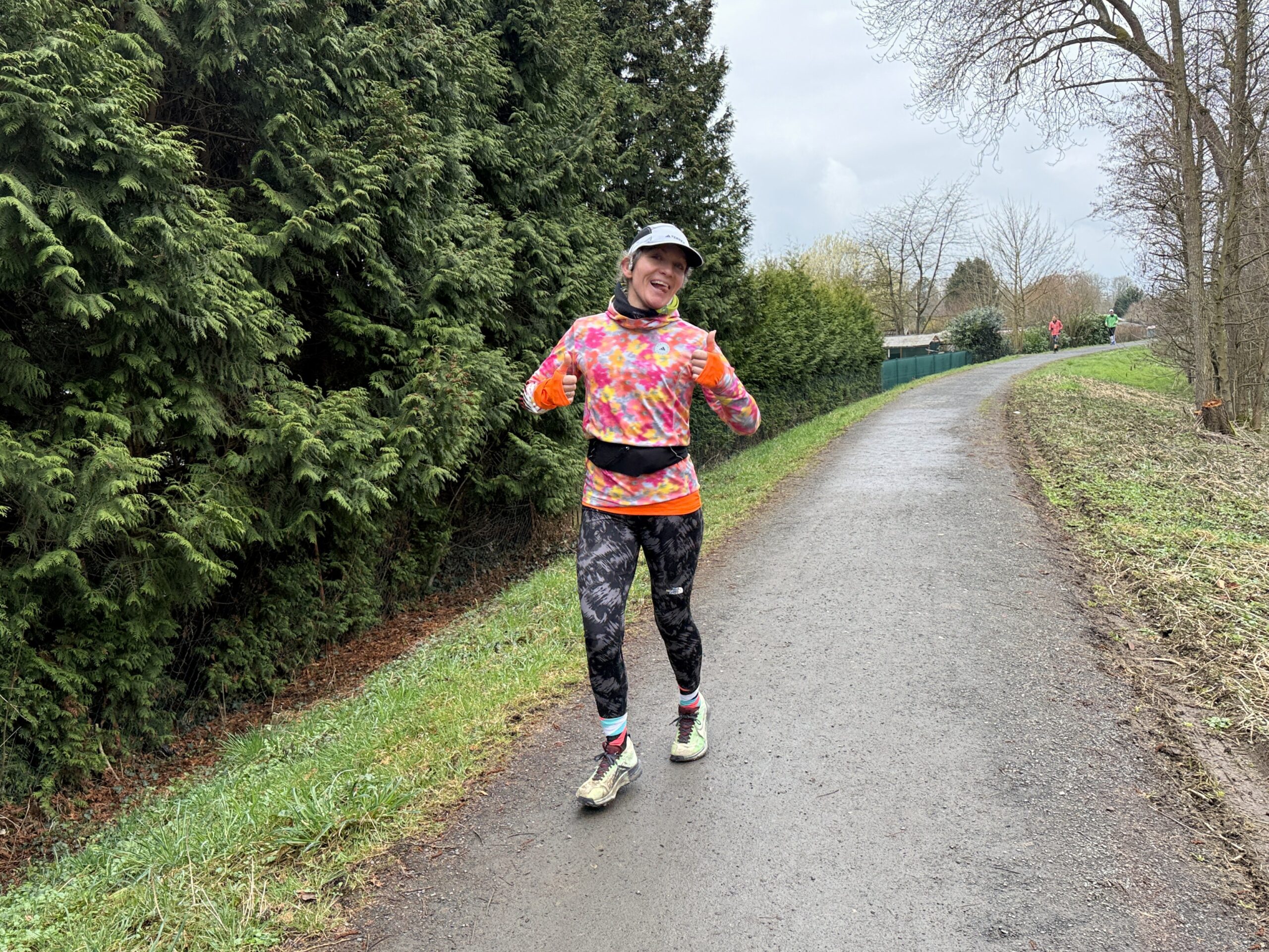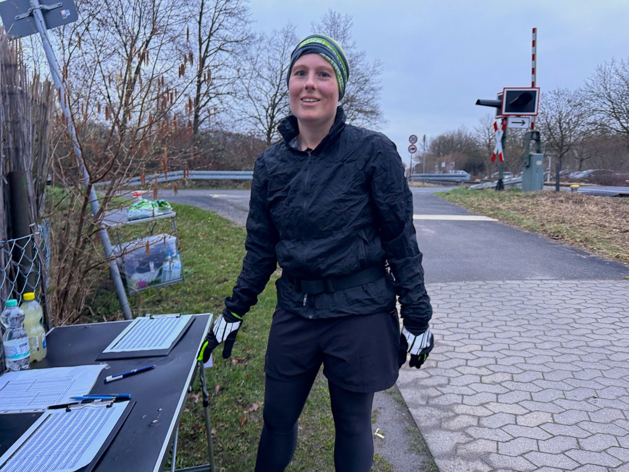 An der Verpflegung laben sich Thorsten G., Joachim, Gisela und Sara an Michaels Getränkeauswahl, es gibt heiße Brühe, Früchtetee, Wasser, Cola, Fruchtsäfte und vieles anderes! 🙂 Danke an Paparazzi Gunla für die Fotos, die ich hier im Bericht verwenden darf! Sie geht jetzt entgegen der Laufrichtung auf die Strecke …
