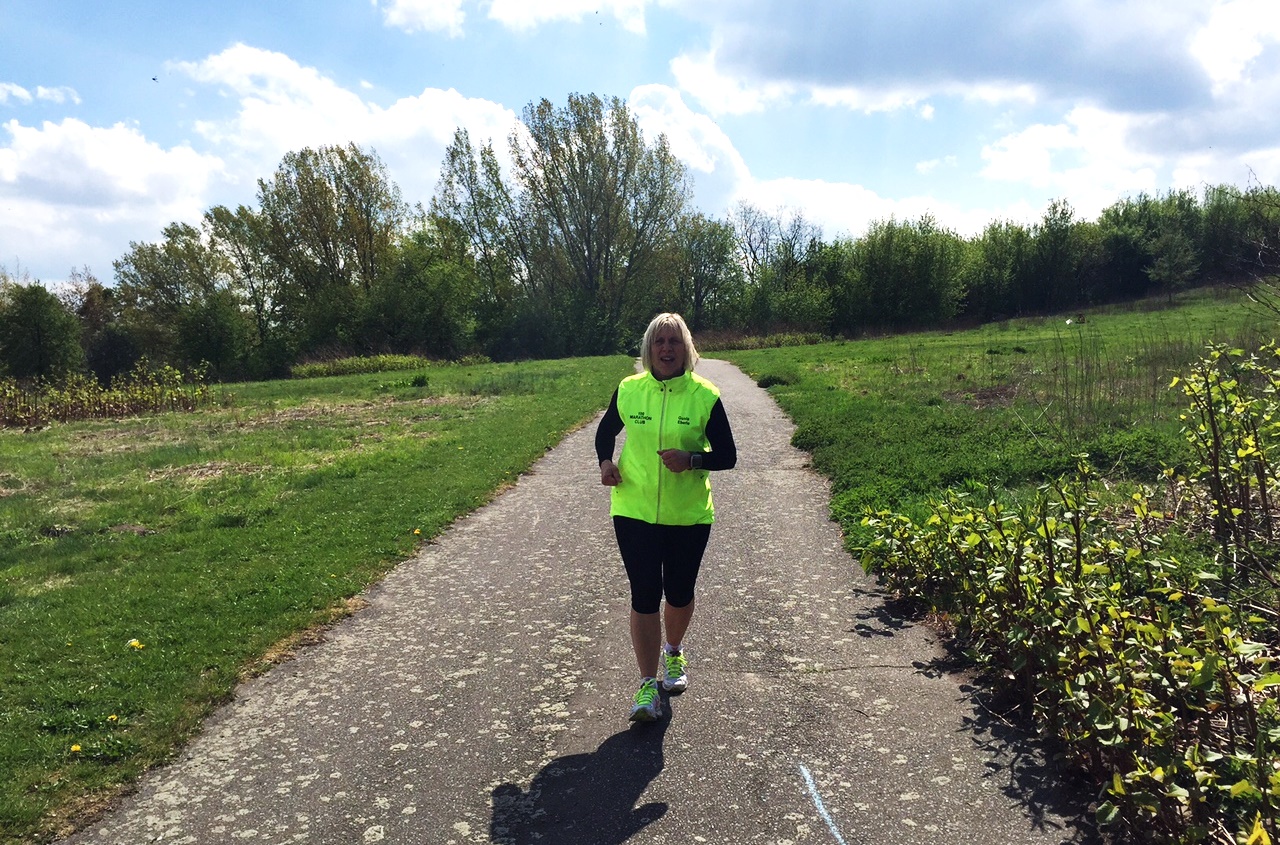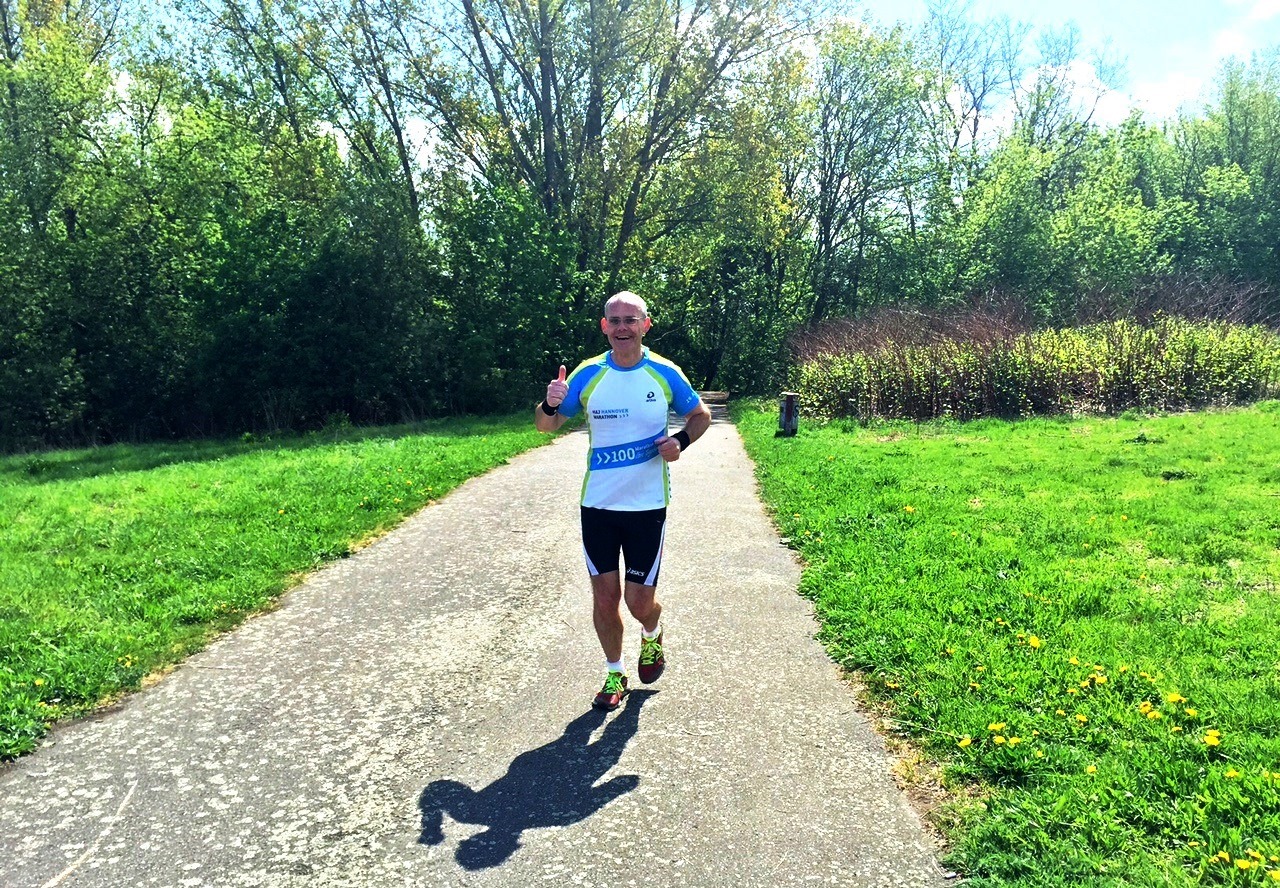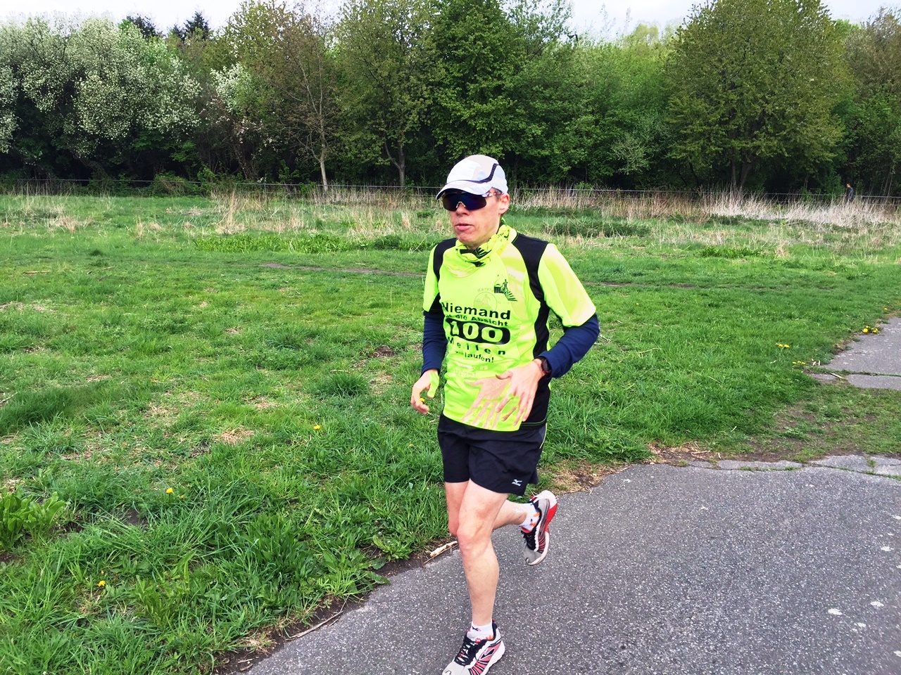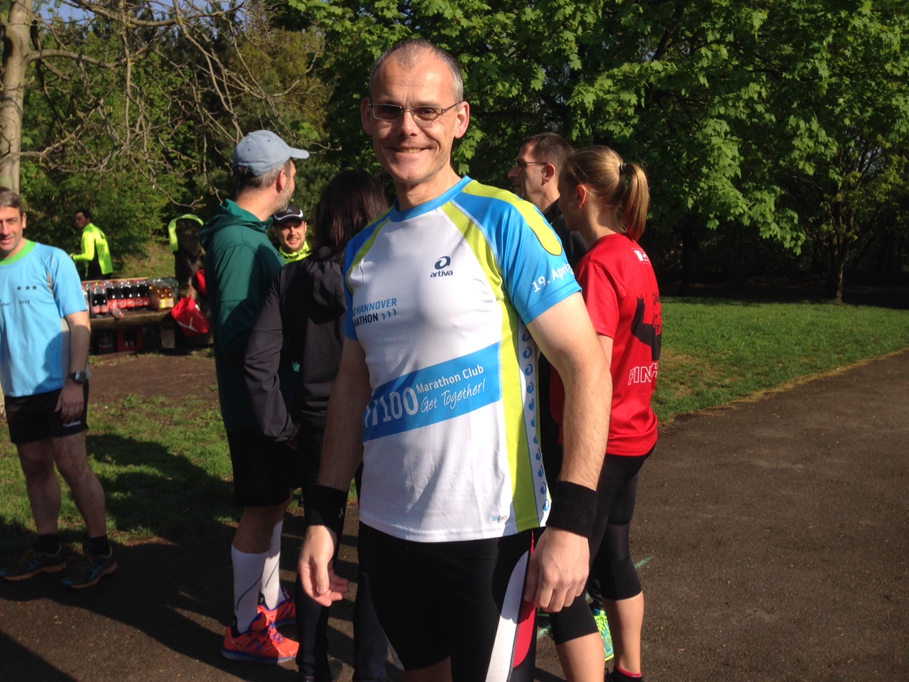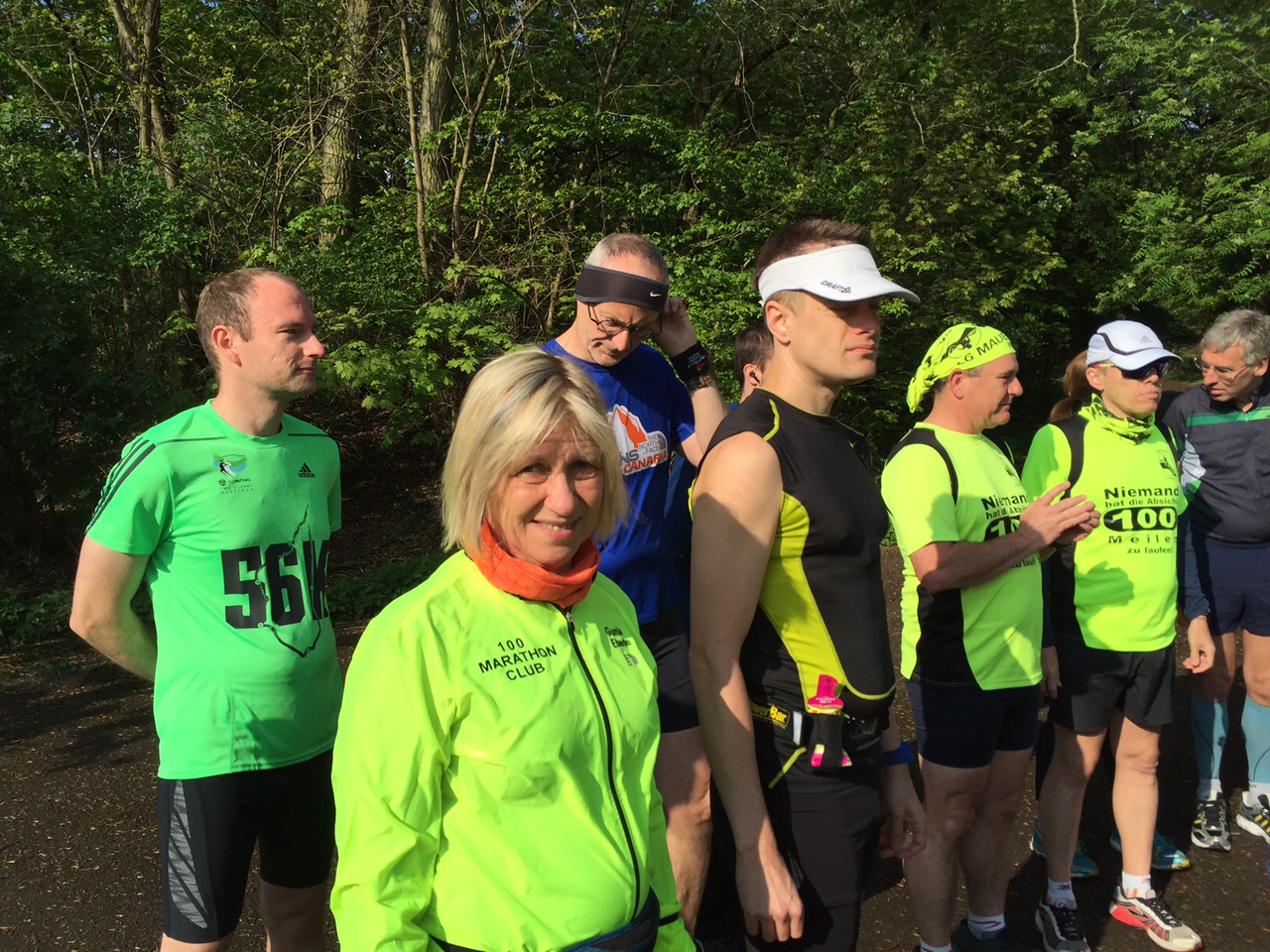 die von Sigrid schon vor mehr als 5 Jahren in 2 Varianten etabliert wurde. Diesmal wurde „unten“ gelaufen, das heißt ca. 570 Höhenmeter über 20 Runden von 2,11 km. Sigrid hielt eine Ansprache zum Anlaß dieses Laufes, dann gab Hajo die Startnummern bekannt, und Marianne schickte uns mitsamt ihren Sohn Thomas -er lief heute seinen ersten Halbmarathon- auf die Runde.