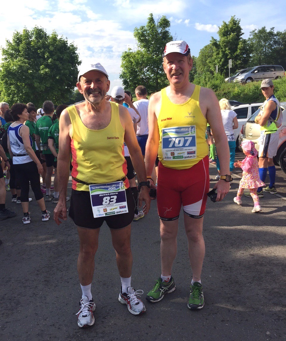 Am Sonnabendmorgen starten die 100er schon um 6 Uhr. Vor dem 9 Uhr-Start des Marathons und der 50 km treffe ich einige bekannte Laufkollegen wie Ulrich, Klaus „Keule“, Sara und Joachim, K.-P., Cornelia, und – natürlich – Michael, unseren Gralshüter des Ziel 60-Wettbewerbes, auch Hahn-Weber genannt. Wer nicht weiß, was das ist, findet einen Link auf meiner Webseite.