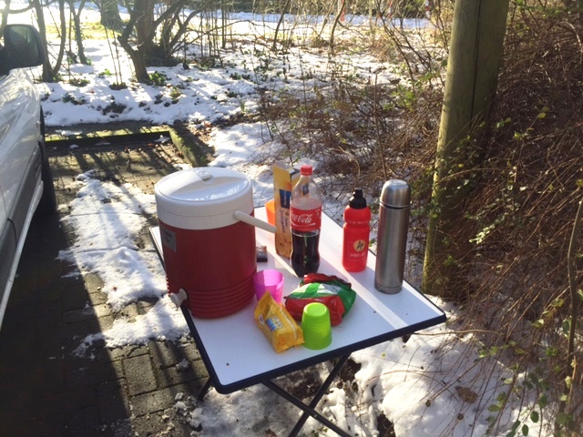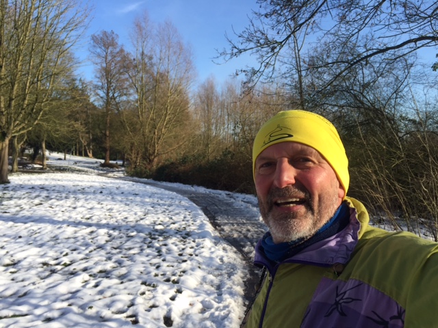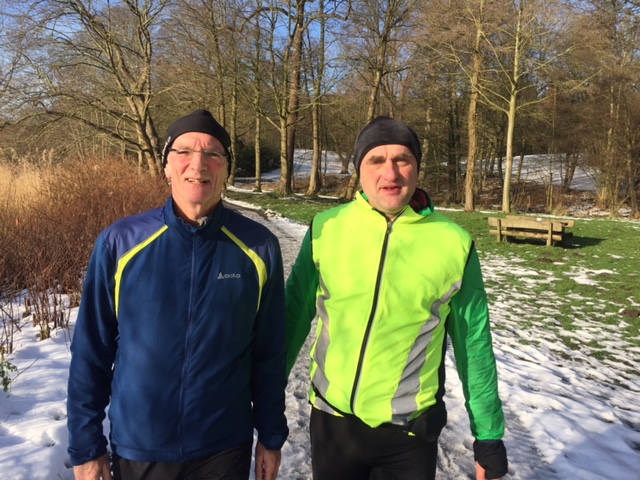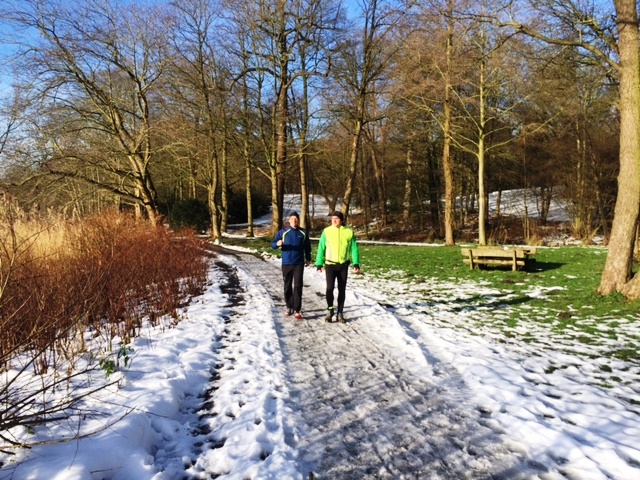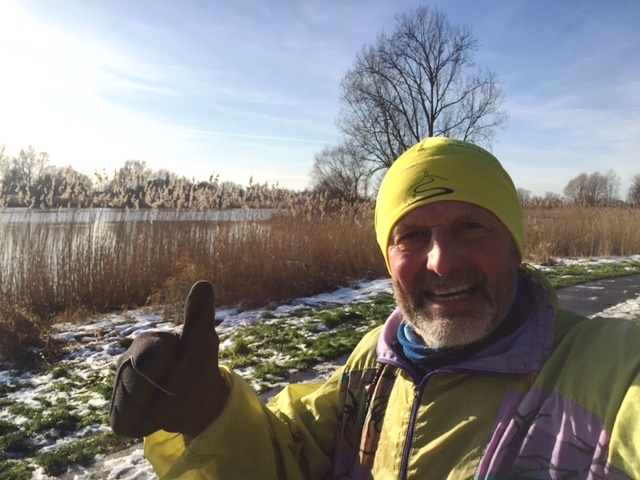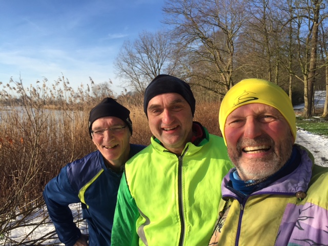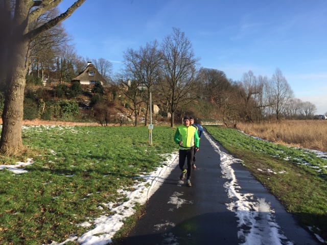 Wir starteten zu dritt schon um 7 Uhr am Lesumsperrwerk in Bremen, Olaf, Winfried und ich. Es hatte getaut und danach nachts wieder Frost gegeben. Wir mußten uns am Anfang im Dunkeln mit Stirnlampen helfen, die Deichstraße war vereist, zum Teil mit Treckerspuren im zu Eis gefrorenen Schneematsch. Das wichtigste war erstmal, nicht zu stürzen. Es waren zunächst 4 Runden von 9,2 km zu laufen, beginnend am Südufer der Lesum, dann über die Brücke der Bremer Heerstraße, auf den Deich an der Nordseite und durch Knoops Park zu Start und Ziel.