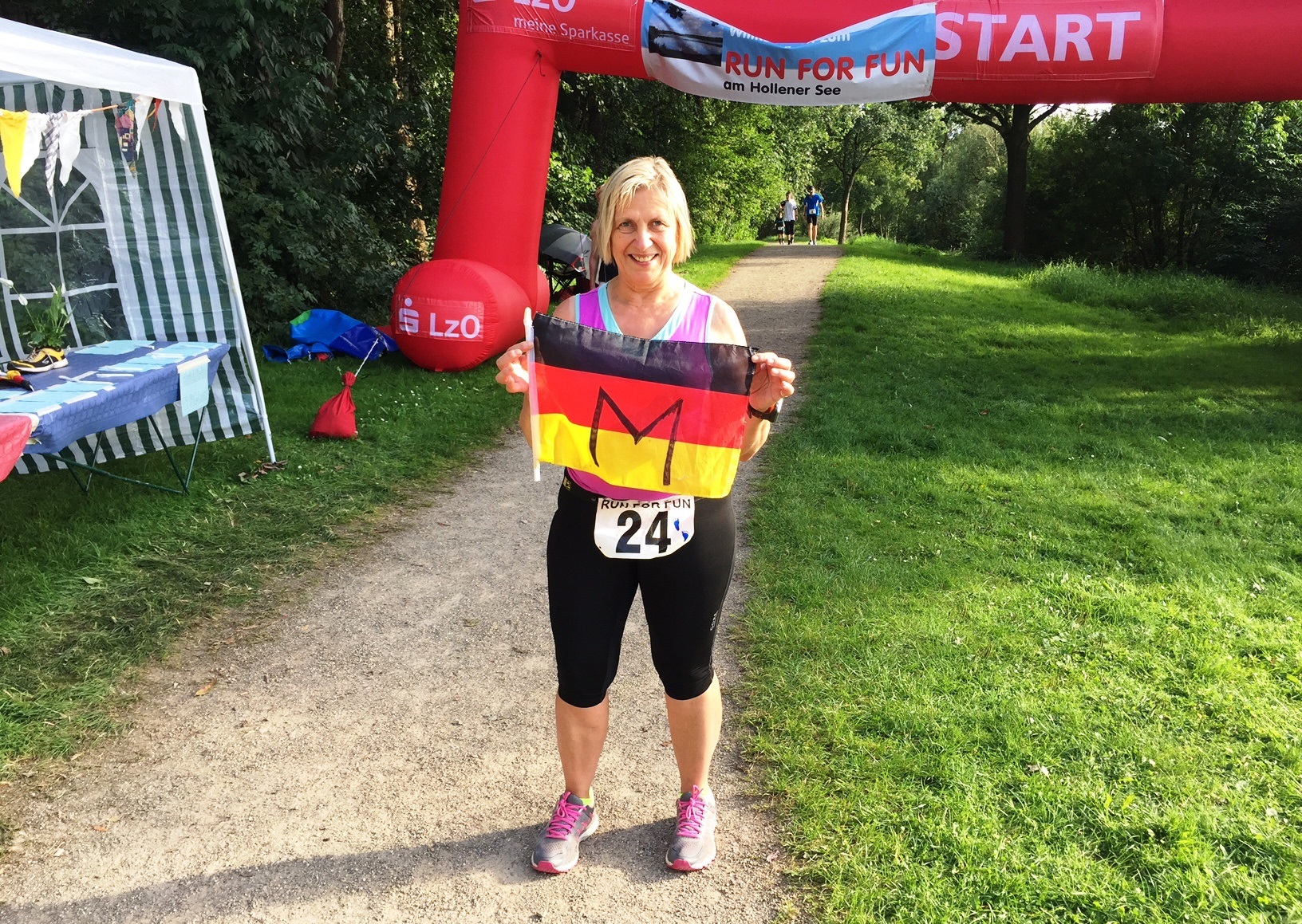 Hier hat Gunla ihre 29. Runde und damit die Marathonstrecke mit der passenden Flagge bewältigt, Gratulation!
