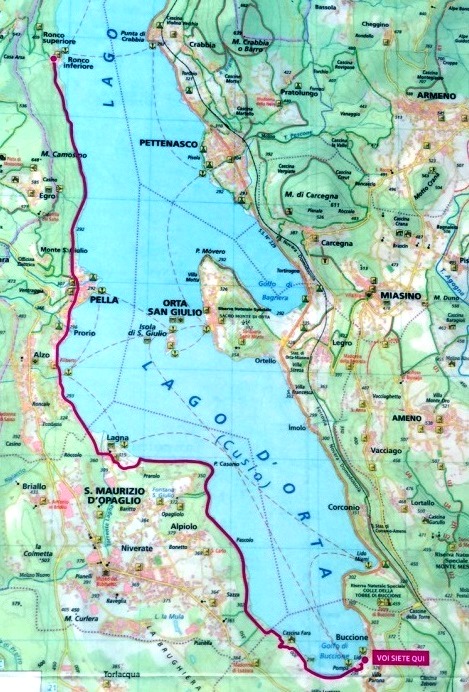 Auf der Karte ist ein Wanderweg von 10,55 km Länge eingezeichnet, der gleichzeitig unsere Marathonstrecke ist. Man läuft zweimal am ruhigeren Westufer nach Ronco, wo die Straße endet, und wieder zurück.