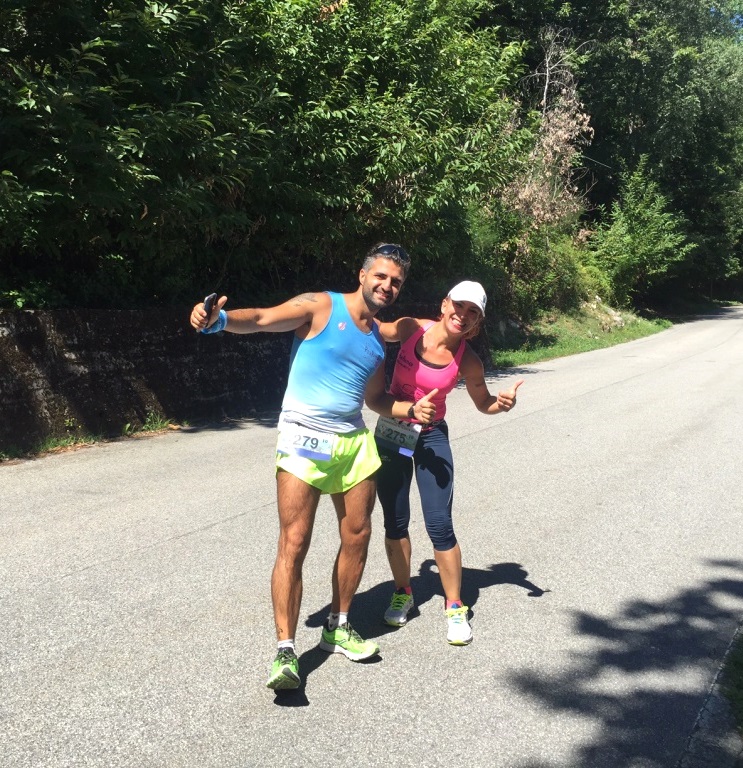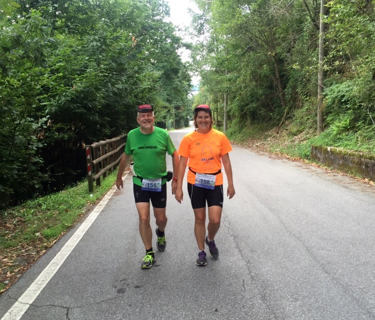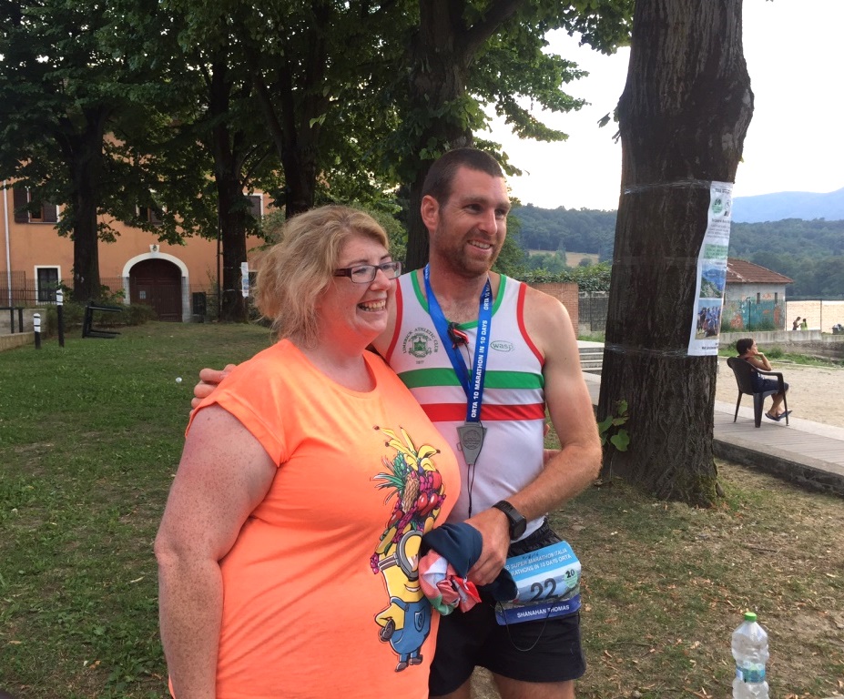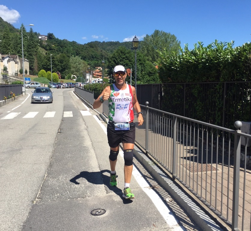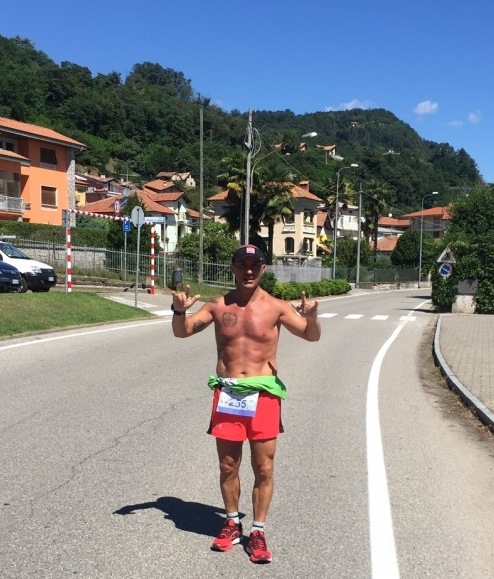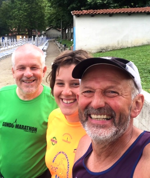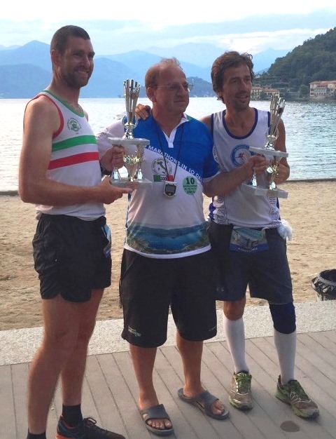 Hier haben wir den ersten Marathon am Lago d’Orta erfolgreich beendet, auf dem Zielfoto zusammen mit Paolo, dem Präsidenten des Club Supermarathon Italia.