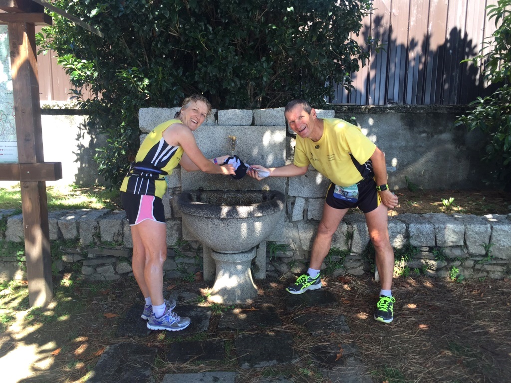 … Chantal und Pascal Comte aus Frankreich, die sich an einer der Wasserstellen auf der Strecke erfrischen, …