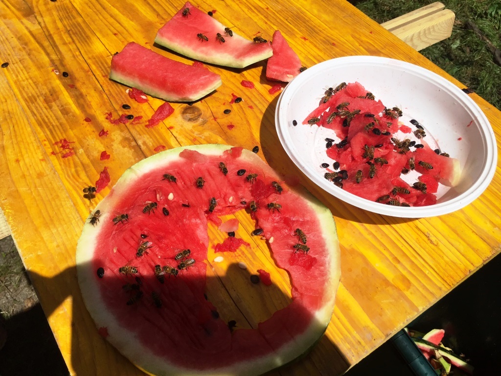 Die Wespen werden zur Ablenkung mit ein paar Resten Wassermelone abgespeist.
