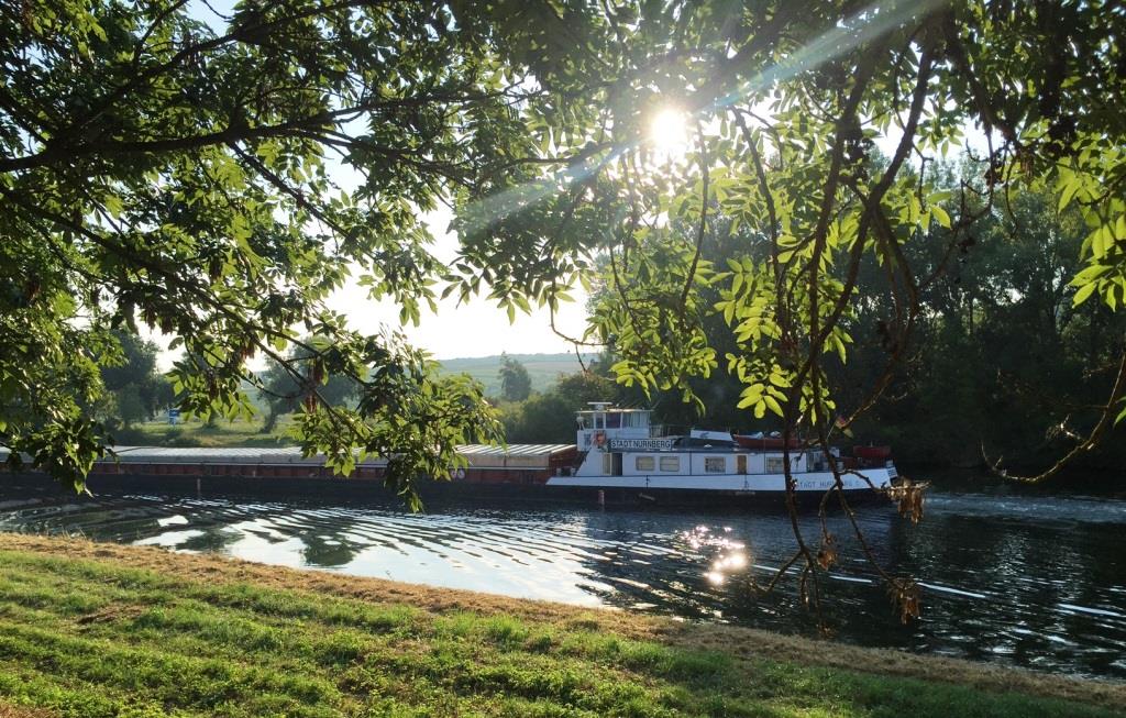Nur ein paar Meter weiter ziehen große Lastkähne vorbei.