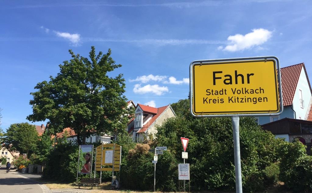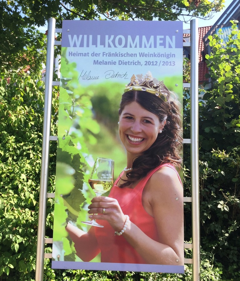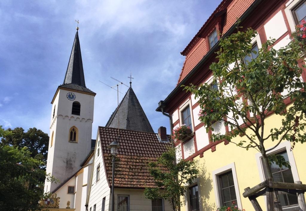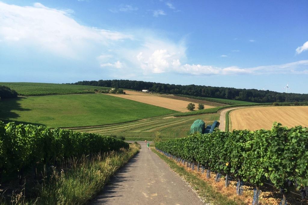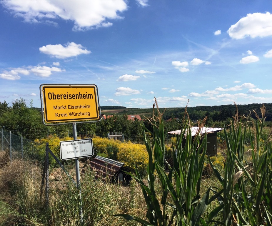 … bis wir dann den Nachbarort Untereisenheim vor uns sehen, im Hintergrund den Kirchturm des Zielortes Obereisenheim.