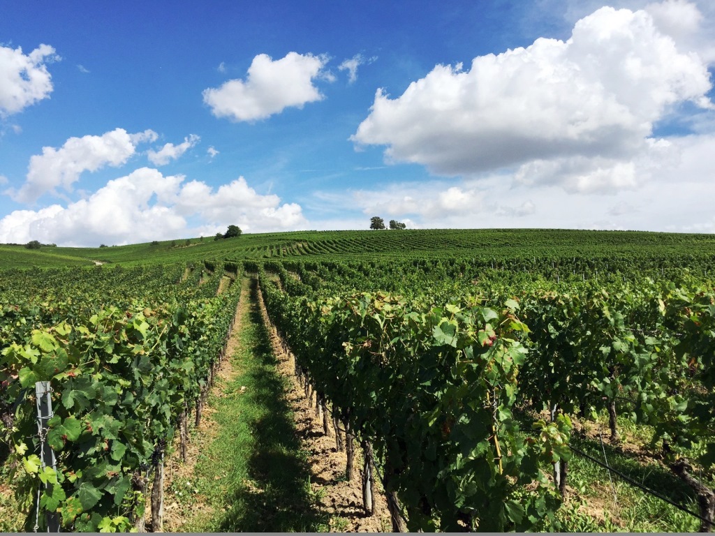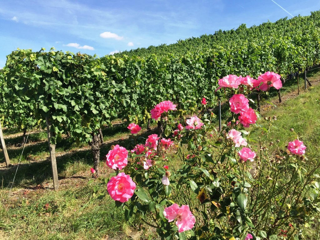 An den Weinbergen findet man fast immer Rosenstöcke, sie sehen nicht nur schön aus zwischen den Weinreben, sondern haben einen tieferen Sinn. Sie sind ein Vorwarnsystem für den Befall von Mehltau, weil diese Pilzerkrankung den Rosenstock immer einige Zeit vor den Weinreben befällt, so können rechtzeitig Gegenmaßnahmen ergriffen werden. Außerdem finden Nutzinsekten Unterschlupf in den Rosen.