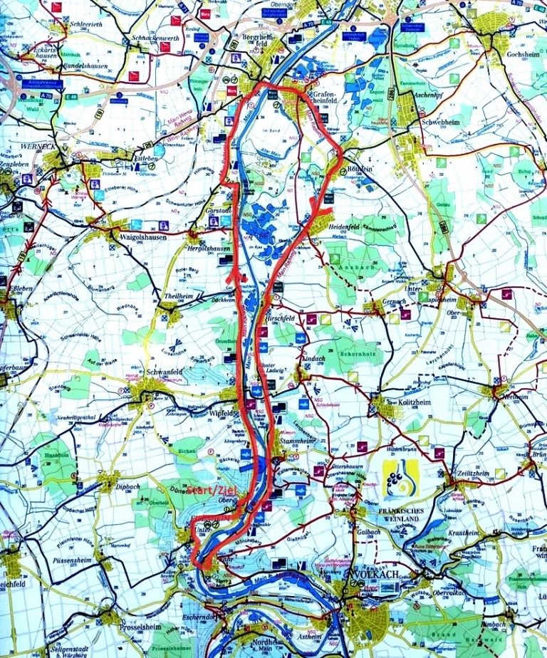 Nicht umsonst hatte ich ein Fahrrad dabei, denn ich wollte vom WoMo-Stellplatz aus einen kleinen Teil des Maintalradweges erkunden, einen Tag nach Süden, einen Tag nach Norden. Für den Montag habe ich hier die Route eingetragen.