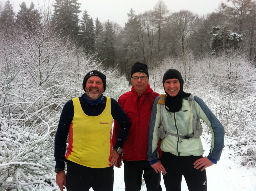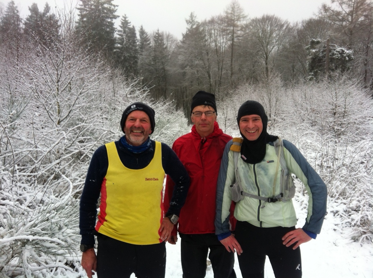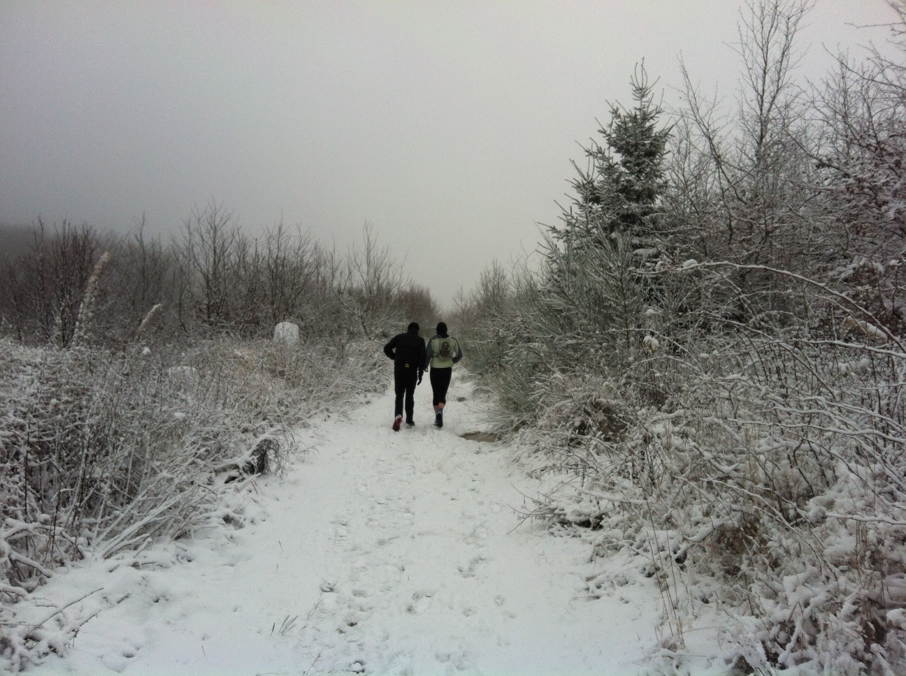 Es hat in der Nacht gut 5 cm Neuschnee gegeben, den ersten dieses Jahr. Zunächst laufen wir zusammen, später werde ich auf die Marathondistanz abbiegen. Der Schnee macht die bergige Strecke von ca. 900 Höhenmetern gegenüber dem Vortag schwerer, es ist knapp über 0 Grad. Gute Sicht hat man heute nicht, es ist neblig, dafür gibt es aber gratis massenweise frische Luft und angenehm kühle Temperaturen mit etwas Schneegrieseln.
