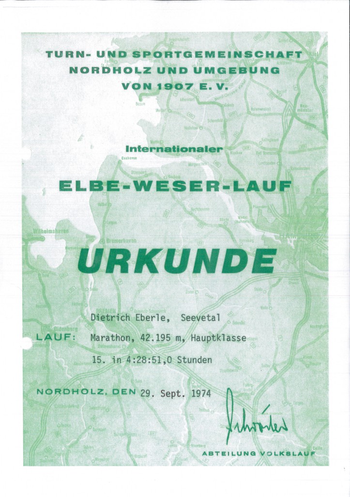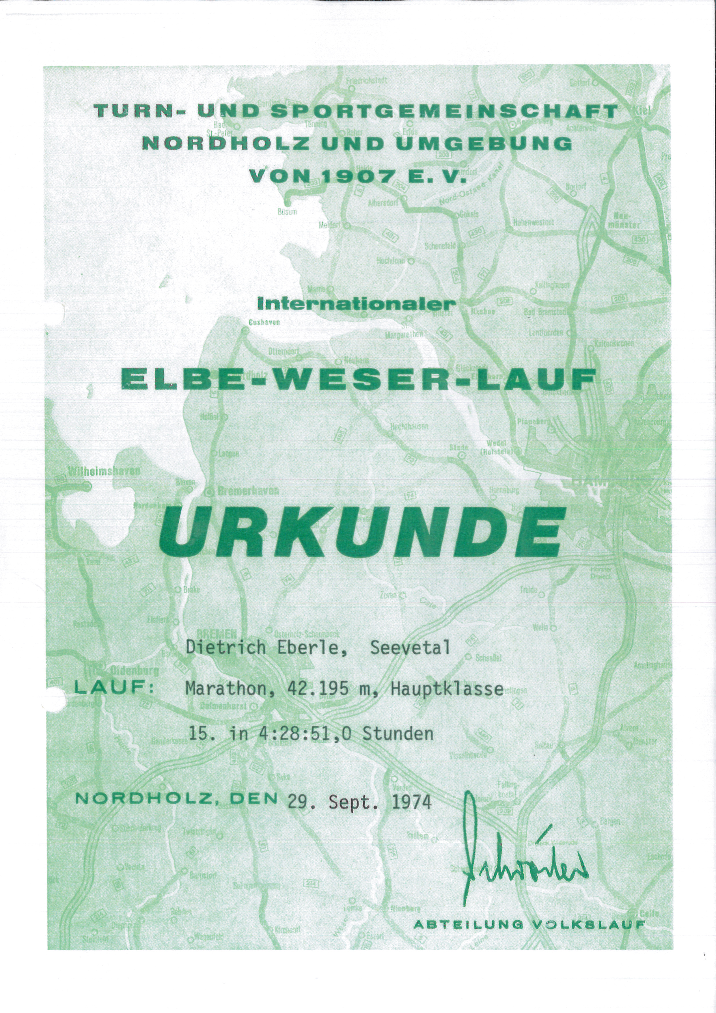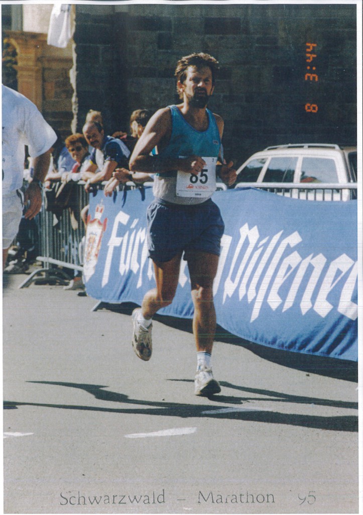 Einmal habe ich entnervt während des Laufes von Marathon auf eine kürzere Strecke, ich glaube 30 km, umgemeldet. Bei einem Schwarzwaldmarathon um 1980 herum trafen wir einen Teilnehmer, der vor seinem ersten Triathlon bereits ein Buch über diese Sportart geschrieben hatte, er sagte, jetzt nach dem Triathlon müsse er das Buch wohl umschreiben….. Beim Hanse-Marathon 1987 lief ich mit der Absicht „unter 3 h“ die ersten 10 km unter 40 Minuten an und bin dann auf 3:25 h eingebrochen.