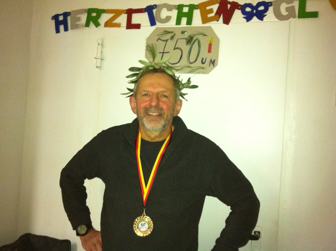 Rechtzeitig vor Einbruch der Dunkelheit rette ich meine Hahn-Weber-Zeit ins Ziel. Hier wartet eine Überraschung auf mich, denn neben Medaille, Urkunde und Ergebnisliste, die mir später Günter verleihen wird (er ist noch auf der Ultra-Strecke) werde ich von Renate und Gunla mit 750 er Jubiläumsgirlande und einem echt Olympischen Olivenzweig-Kranz geehrt!
