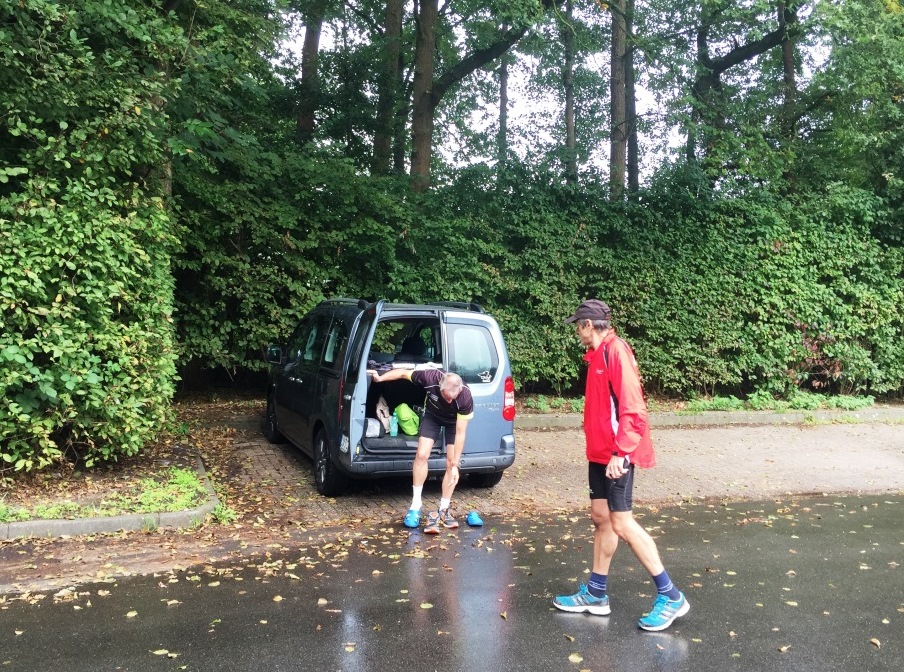 Wir treffen uns auf dem Parkplatz am Freilichtmuseum Mühlenhof und wollen um 11 Uhr starten. Arno zieht sich schon mal die Laufschuhe an, und Andreas gibt ihm gute Tipps.