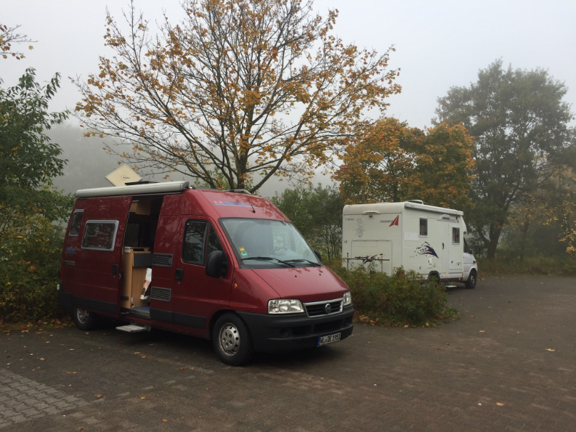 Aber der Tag sollte schön werden, das war nur Nebel. HJH und Helmut hatten hier auf dem Parkplatz mit ihren Womos schon übernachtet, und ich parkte daneben ein