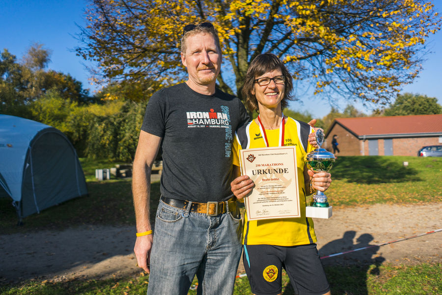 Während die Hälfte der Marathonstarter noch auf der Strecke ist, wird Beate schon für ihren ebenfalls 250. M/U geehrt! Vor einem Jahr hatte sie hier bereits die Nr. 200 gefinisht. Herzlichen Glückwunsch!