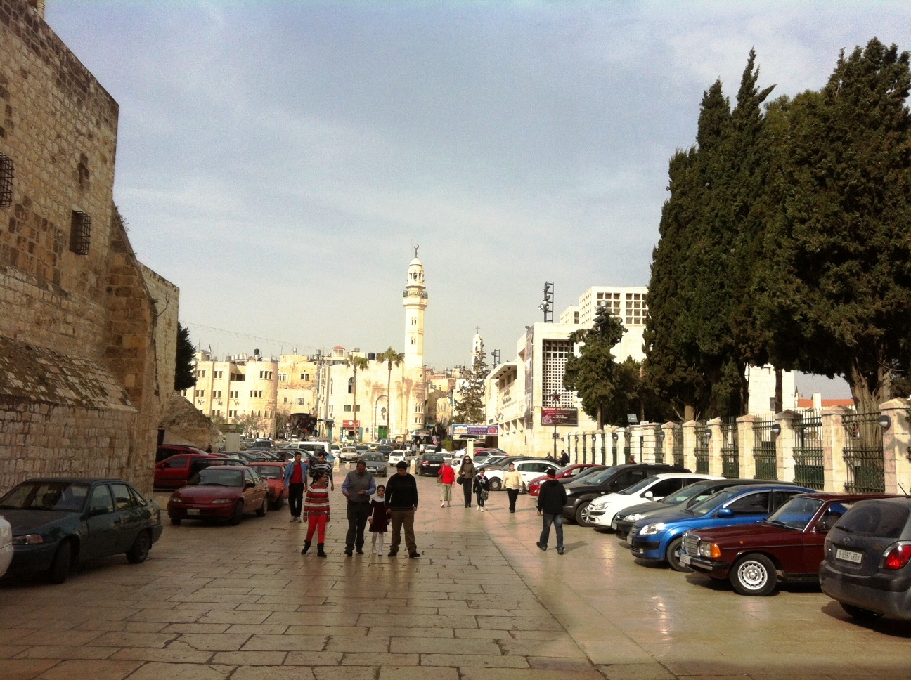 Der Vorplatz der Geburtskirche in Bethlehem. Hier wurde Jesus Christus nach heutigem Wissensstand ca. 4 bis 7 v. Chr. in einer zu besichtigenden Höhle / Grotte geboren, die jetzt von der Kirche überbaut ist.