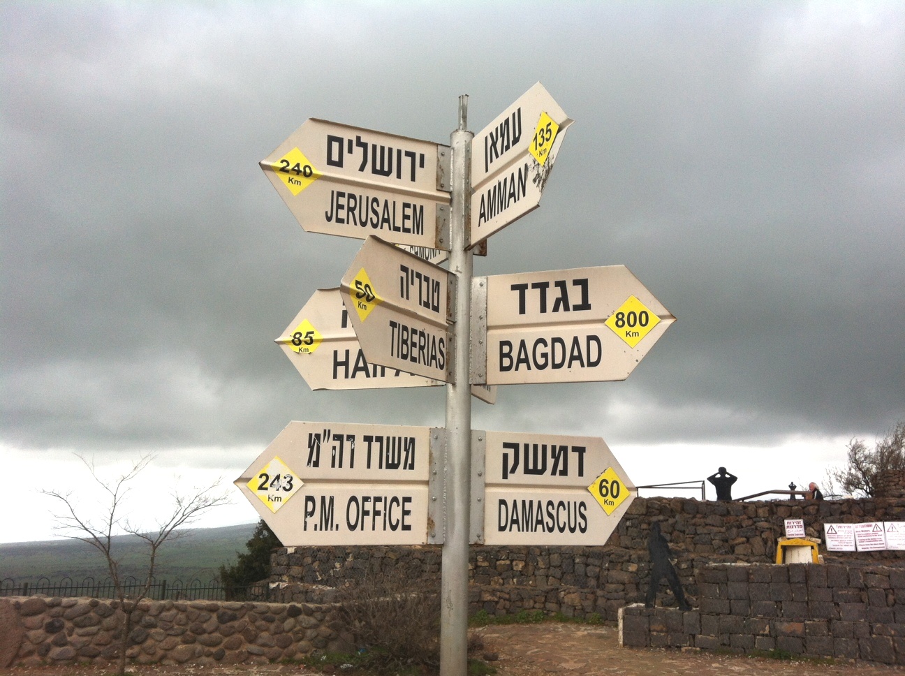 Auf den Golanhöhen, einem strategisch wichtigen Höhenzug im Grenzgebiet zu Syrien. Hier entspringen die beiden Quellflüsse des Jordan. Dieses Gebiet wurde nach den Kriegen mit Syrien 1967 und 1973 von Israel besetzt und später annektiert. Es befinden sich hier noch viele verminte und deshalb abgezäunte Flächen.