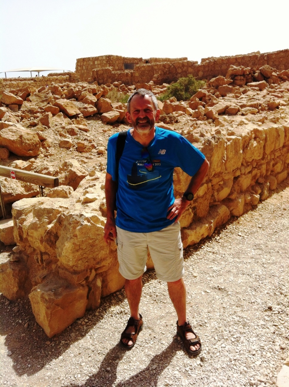 Am nächsten Tag stand dann eine Fahrt ans Tote Meer, 420 m unter NN, tiefster Punkt der Erde, auf dem Programm. Bei optimalem Tourismuswetter fuhr unsere Laufreisegruppe zunächst an der über 10000 Jahre alten und mit 250 m unter NN tiefsten Stadt der Welt Jericho vorbei und weiter entlang des Westufers des Toten Meeres. Hier fand im Jahre 1947 ein Hirtenjunge 2000 Jahre alte Schriftrollen mit biblischen Texten in einer Höhle. Das Ziel ist aber die auf einem Hochplateau 400 m über dem Spiegel des Toten Meeres, also ca. auf Normal Null, liegende Festung Masada. Herodes, von den Römern eingesetzter König Israels, ließ die Befestigungsanlage vor Christi Geburt bauen, um bei Gefahr sicher vor Verfolgung zu sein. Die Festung geriet in den folgenden Jahrhunderten in Vergessenheit und blieb lange Zeit unentdeckt, man kannte sie nur noch aus den Aufzeichnungen des römischen Geschichtsschreibers Flavius Josephus. Aufgrund seiner Schilderungen wurde sie erst 1838 wiederentdeckt…..