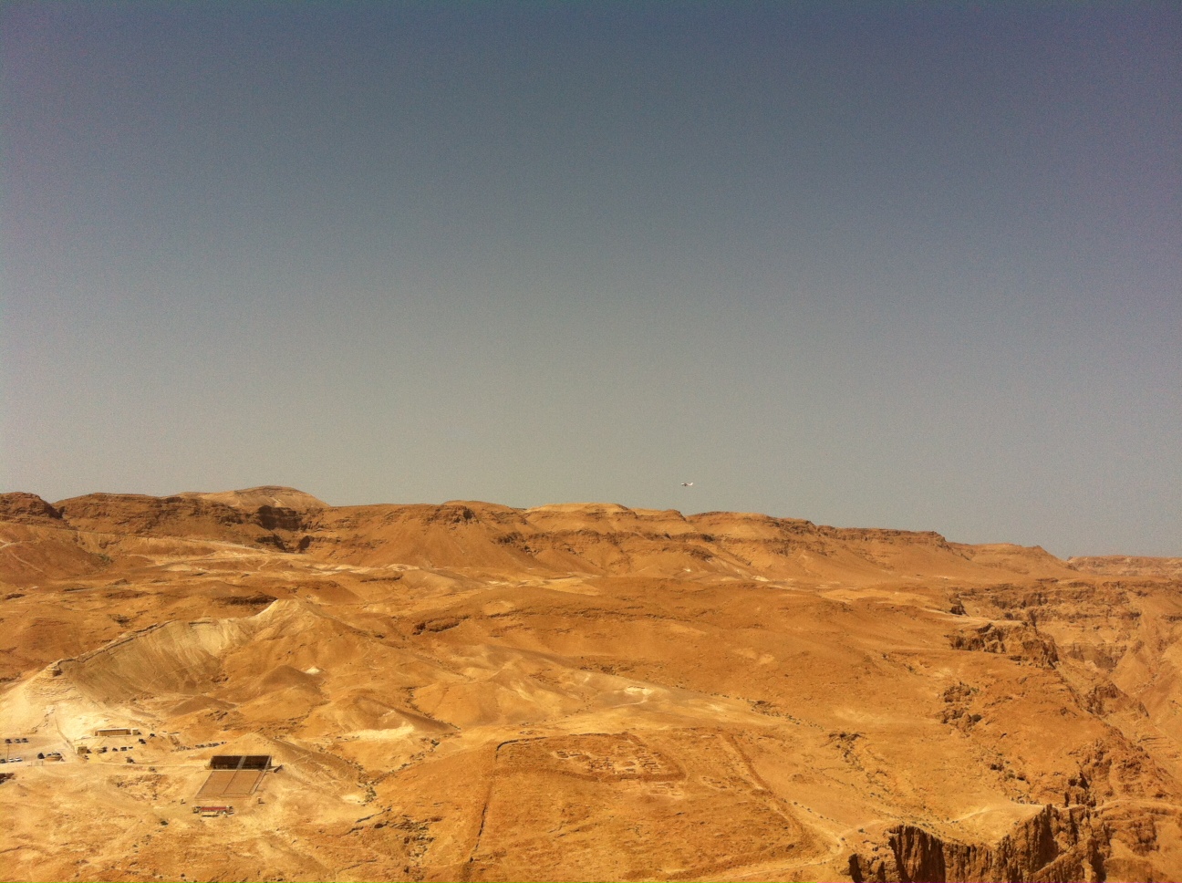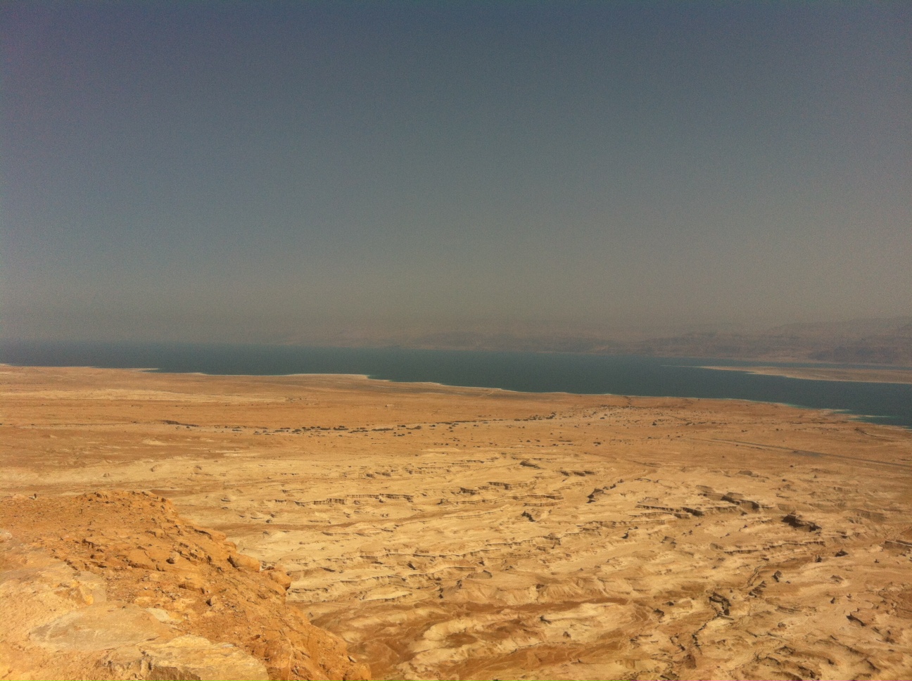 Blick von der Festung auf das Tote Meer. Einziger Zufluß ist der Jordan, der hier aber weniger Wasser zuführt als auf der Wasseroberfläche verdunstet, weil vorher große Mengen als Trinkwasser abgezapft werden. Das führt zu einem dramatischen Absinken des Wasserspiegels, jedes Jahr um 1 m!! In Jordanien und Israel gibt es Überlegungen, Zuflüsse vom Mittelmeer oder vom Roten Meer zu schaffen, aber es wird wohl bei den Überlegungen bleiben…. Das andere Ufer gehört schon zu Jordanien. Dort bin ich 2005 den Dead Sea Ultra gelaufen.