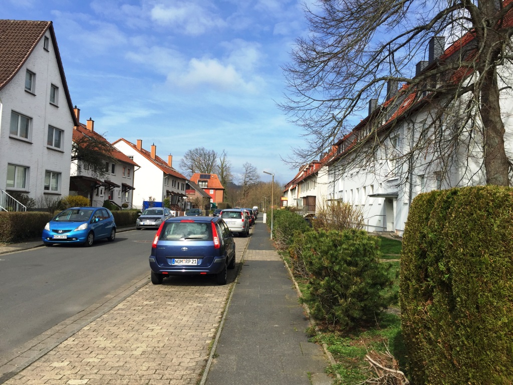 Hier sind wir an der westlichen Stirnseite, ungefähr 200 m durch Wohngebiet